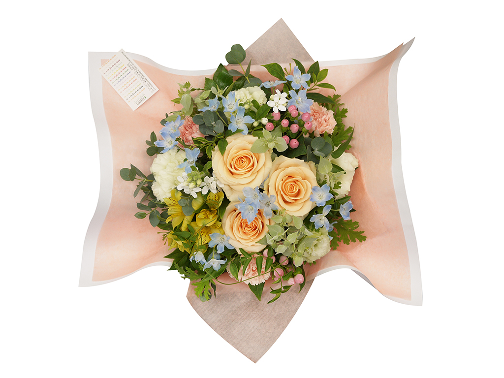 絵画に見立てたレ ミルフォイユ ドゥ リベルテのオリジナルラッピングでお届けいたします。 白い厚手の紙と薄紙の2枚重ねは、外側の白い紙を絵の額縁に、花材によって変える内側の紙色は絵画の背景の色に見立て、花をより美しく見せることができます。