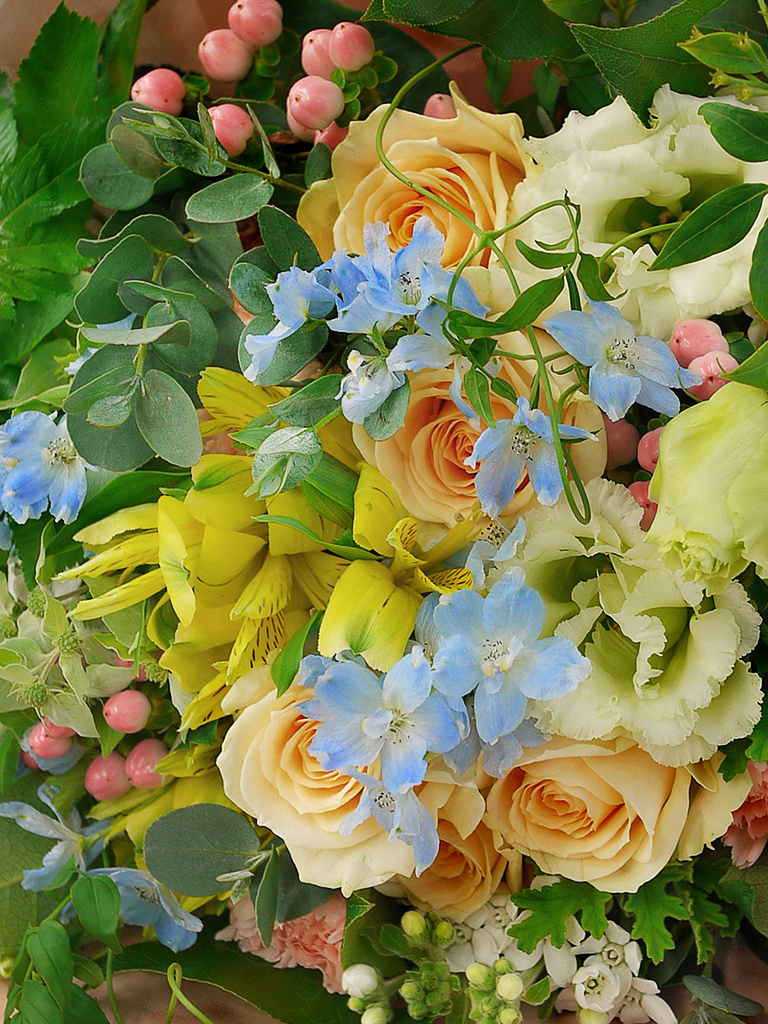 レ ミルフォイユ ドゥ リベルテのブーケロンは、庭の風景を切り取ったようなナチュラルスタイルで、花の持つ自由な動きを活かし、色遊びを楽しむブーケです。上品で華やかな花々は、お部屋の雰囲気を一気に明るくしてくれます。