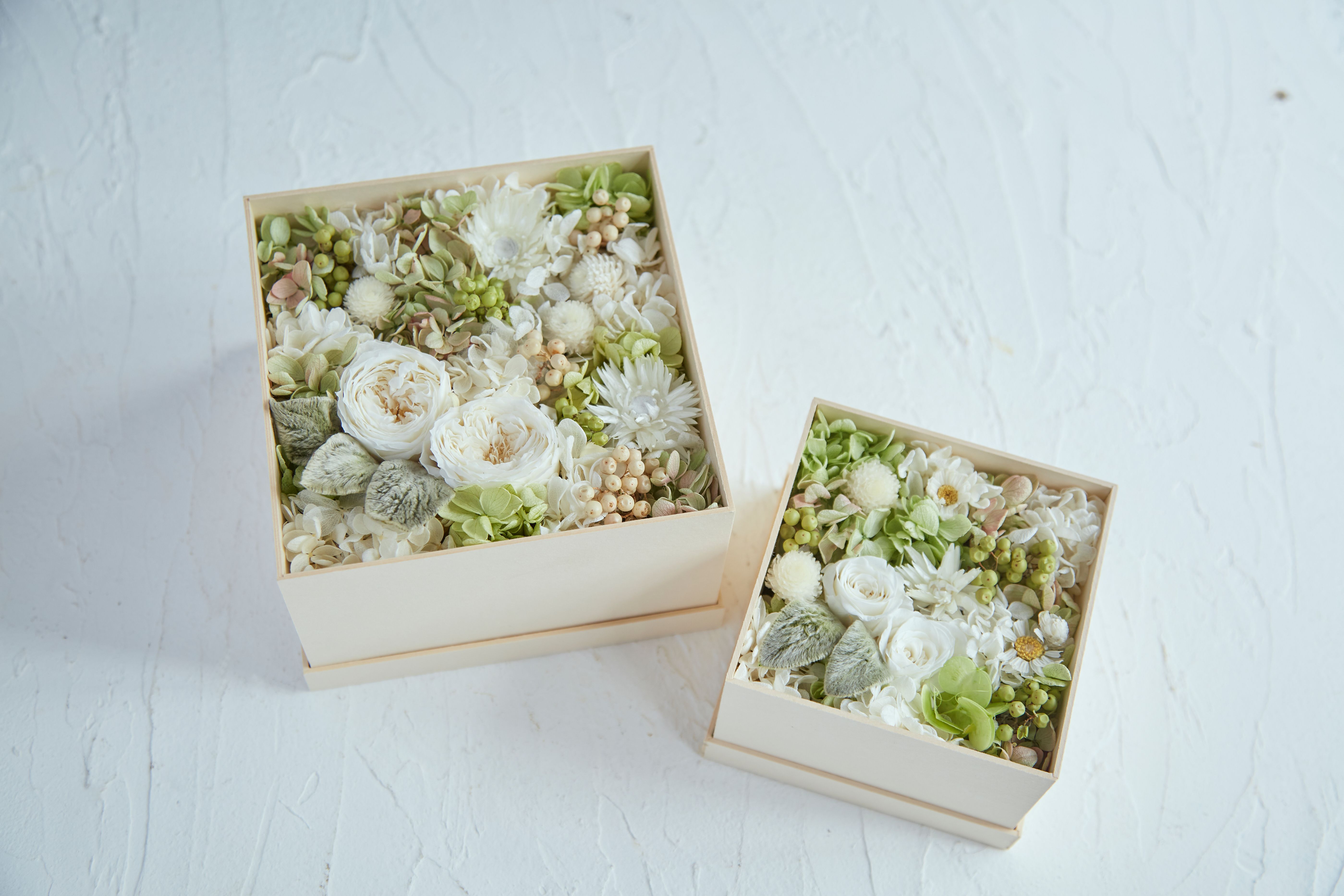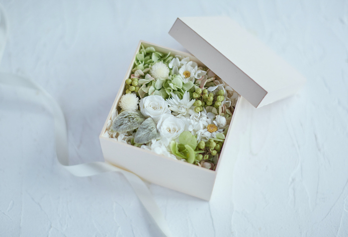 繊細な白い花と柔らかなグリーンをふんだんに敷き詰めた、プリザーブドフラワーのボックスギフトです。お手入れなしで長く使っていただけます。感謝の気持ち伝えるのにぴったりのアレンジメント。専用ボックスに入れてお届けするのでプレゼントにもおすすめです。
