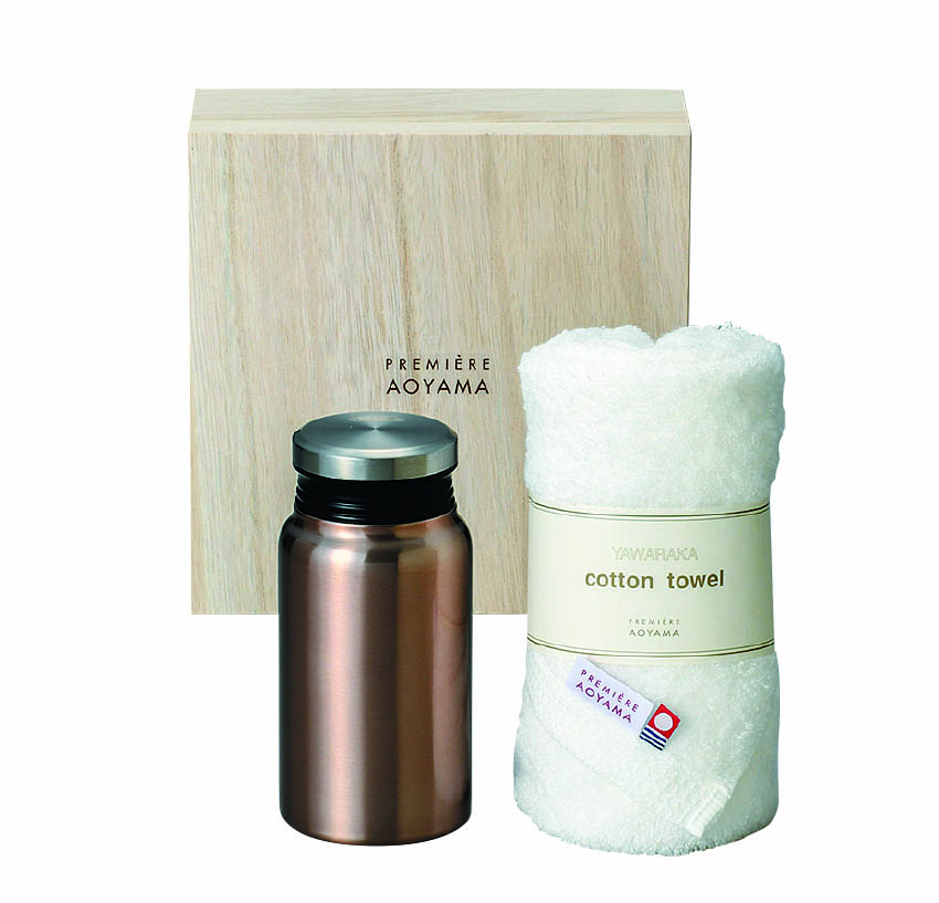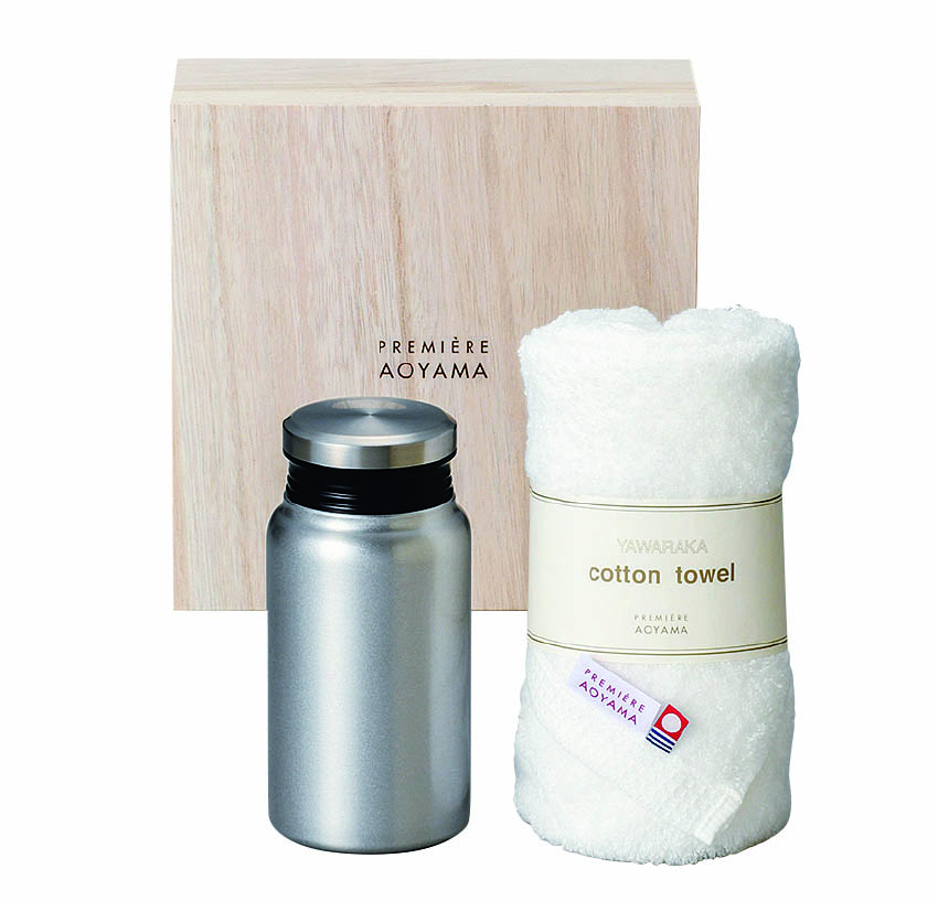 ふわふわで吸水性抜群のタオルと真空二重構造の機能的なボトルが木箱にセットされて、プレゼントとして大切な人へ。