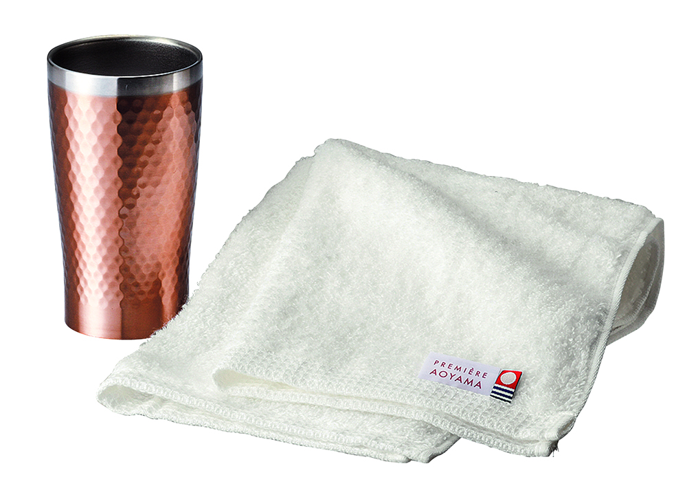 | サイズ | タンブラー:(口径75㎜×高さ130㎜/340㎖) フェイスタオル:(750㎜×340㎜) |