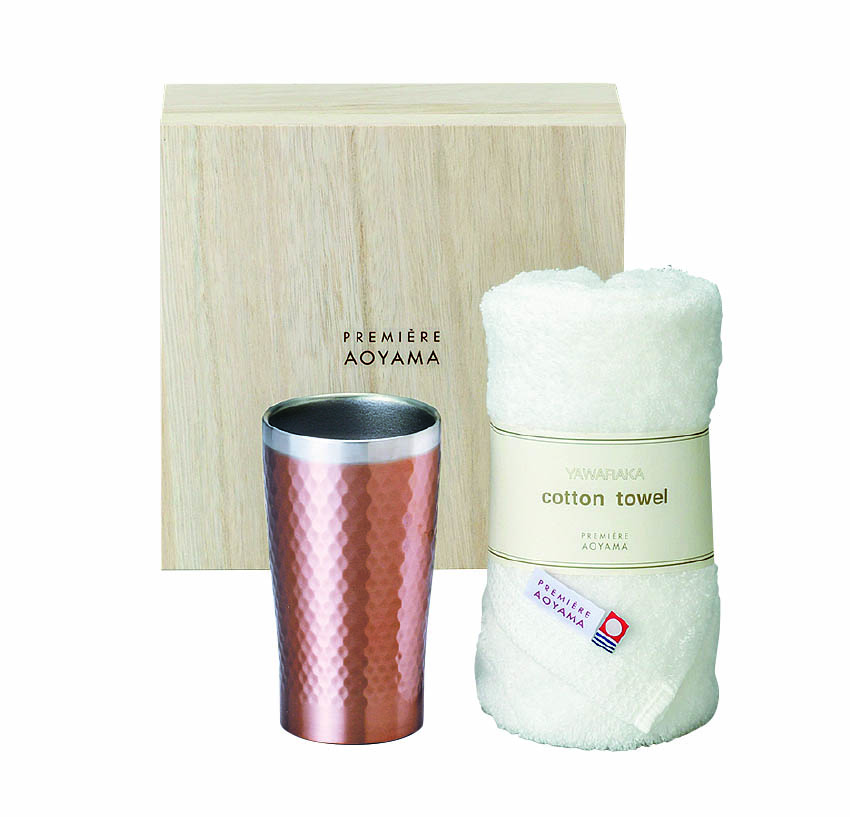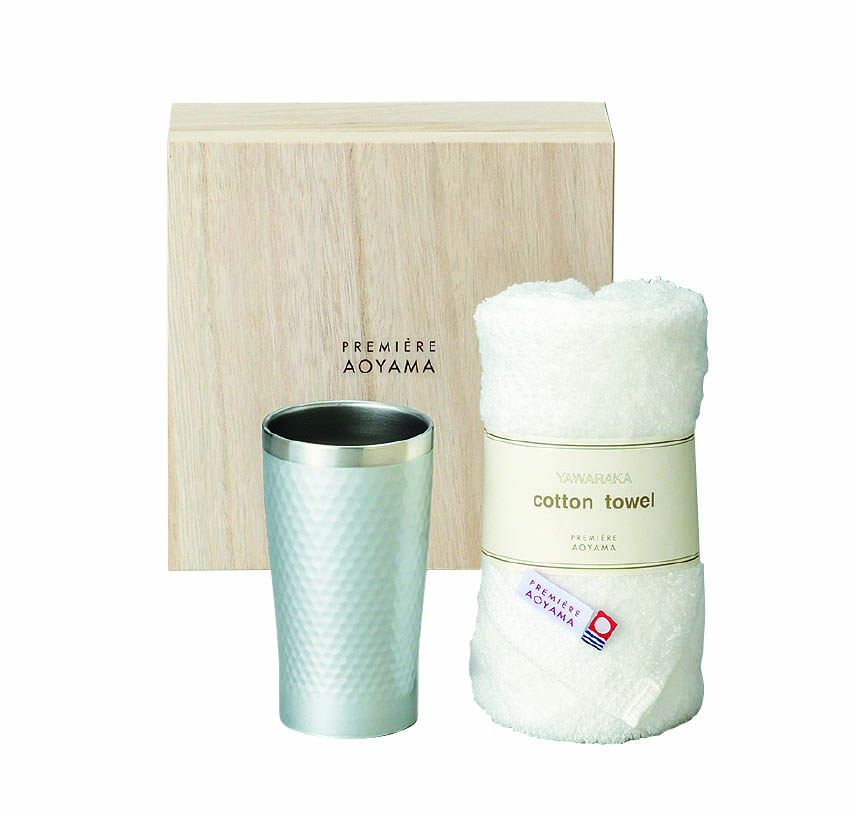 ふわふわで吸水性抜群のタオルと真空二重構造の機能的なタンブラーが木箱にセットされたギフトです。