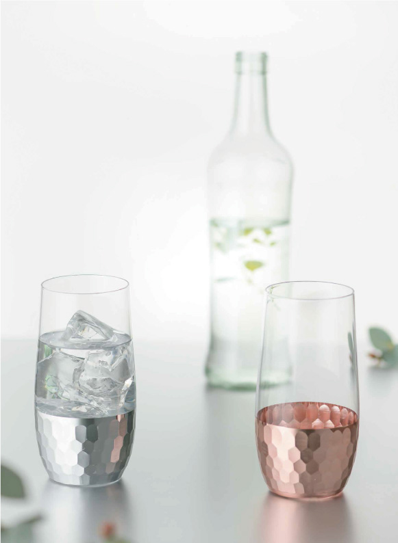 こちらの商品は、槌目風の独特なテクスチャーが楽しめるコレクション。上部をガラスにすることで槌目のデザインがより際だちます。また、飲み物の冷たさが直接伝わるので、清涼感をお楽しみいただけます。