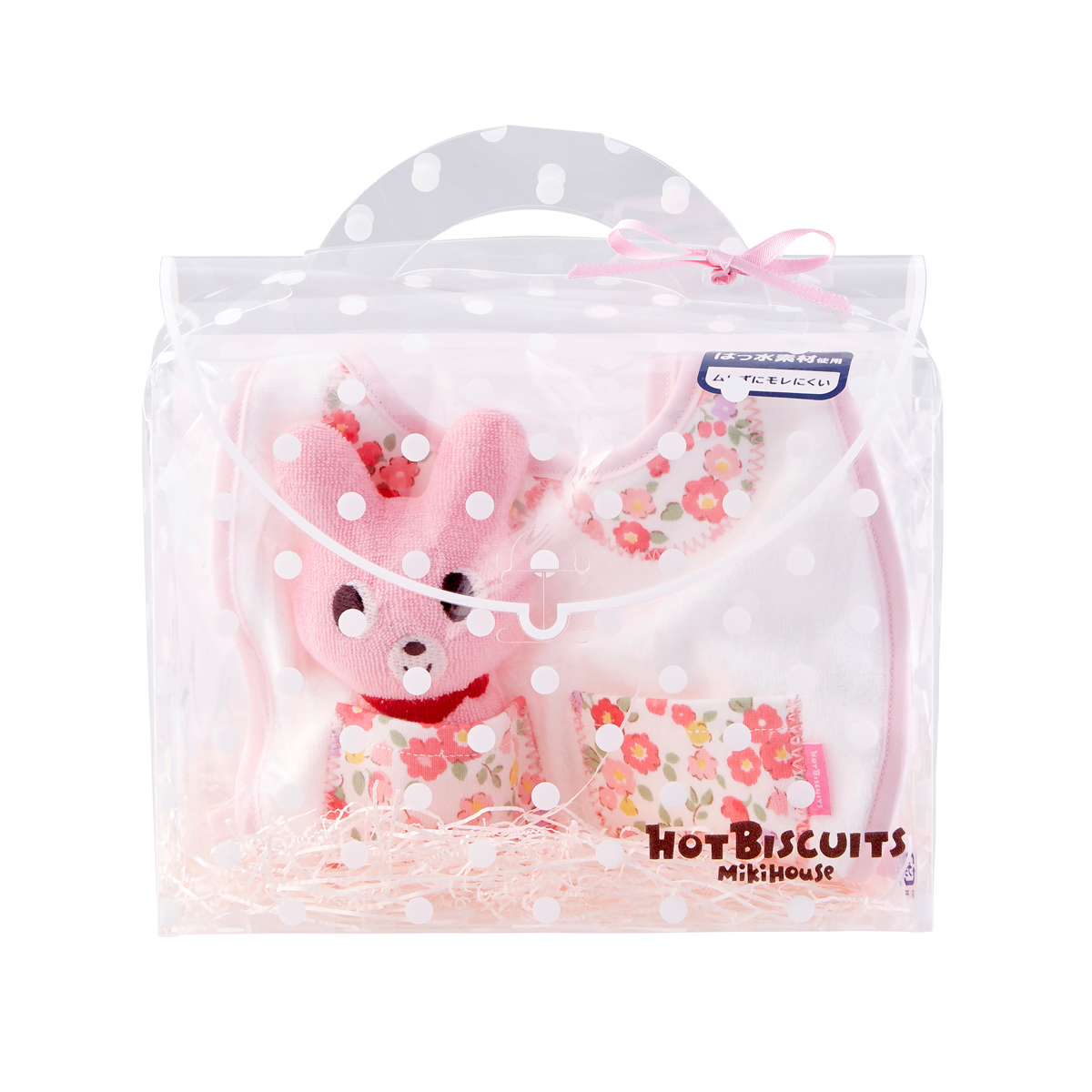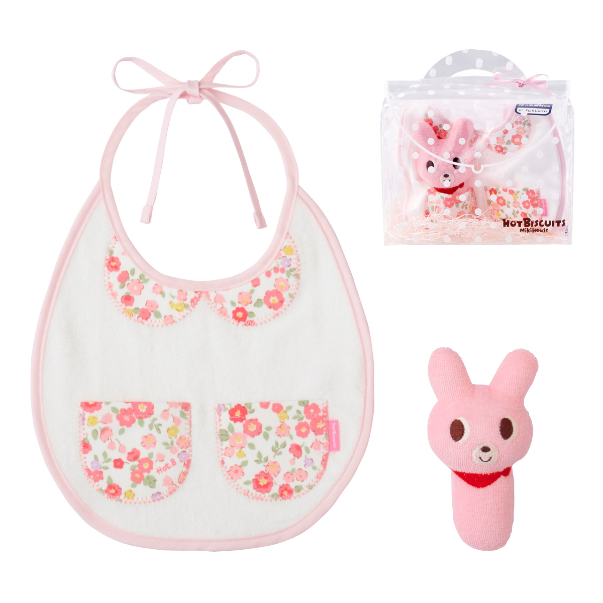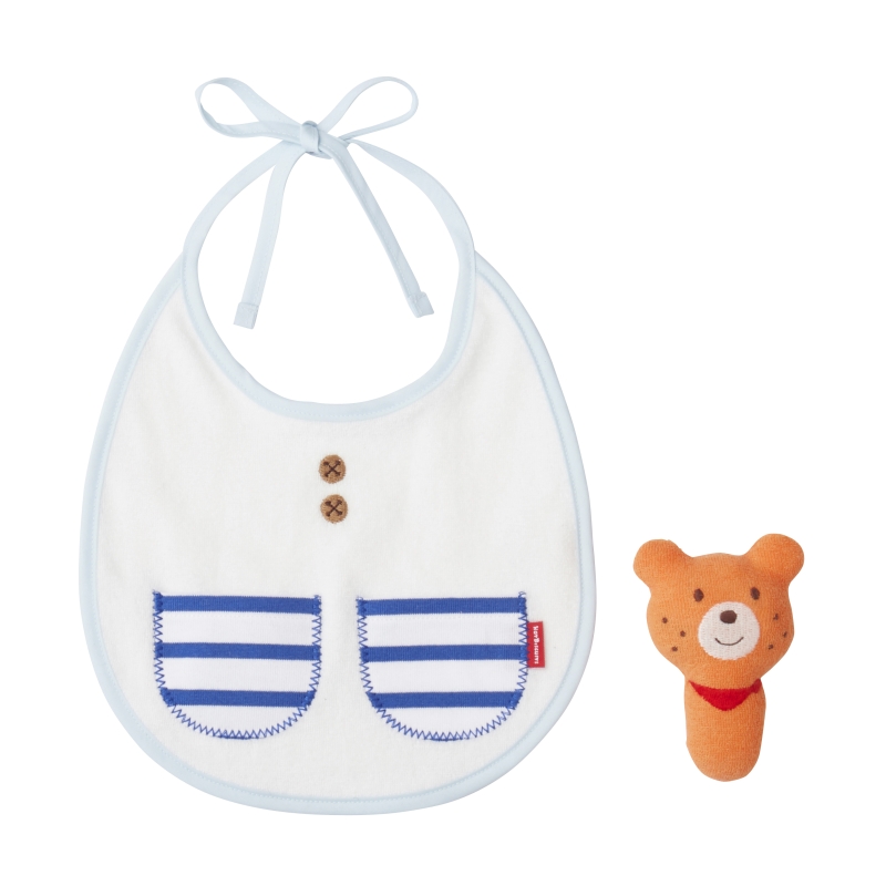 大口注文・法人のお問い合わせはこちら出産祝いの定番のスタイとラトルがセットになった嬉しいギフトセット。 ドット柄のクリアケース付きです。 ミニポケットが付いたスタイと、ビーンズくんとキャビットちゃんのやわらかラトルがケースに入っているので、贈りものとしても相応しいですね。 ラトルはベビーちゃんの初めてのおもちゃに最適。 スティックタイプなので握りやすく、やさしい鈴の音にベビーちゃんもきっとにっこり笑顔に。