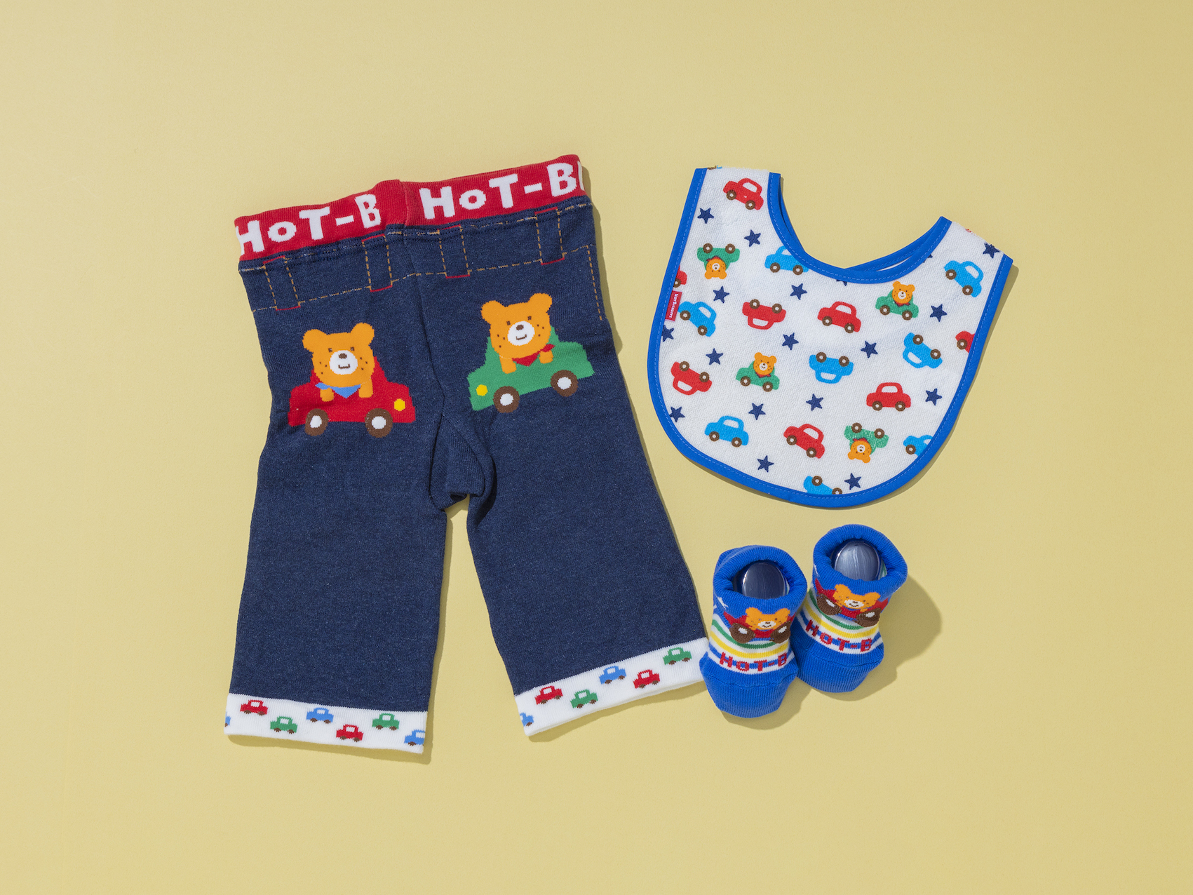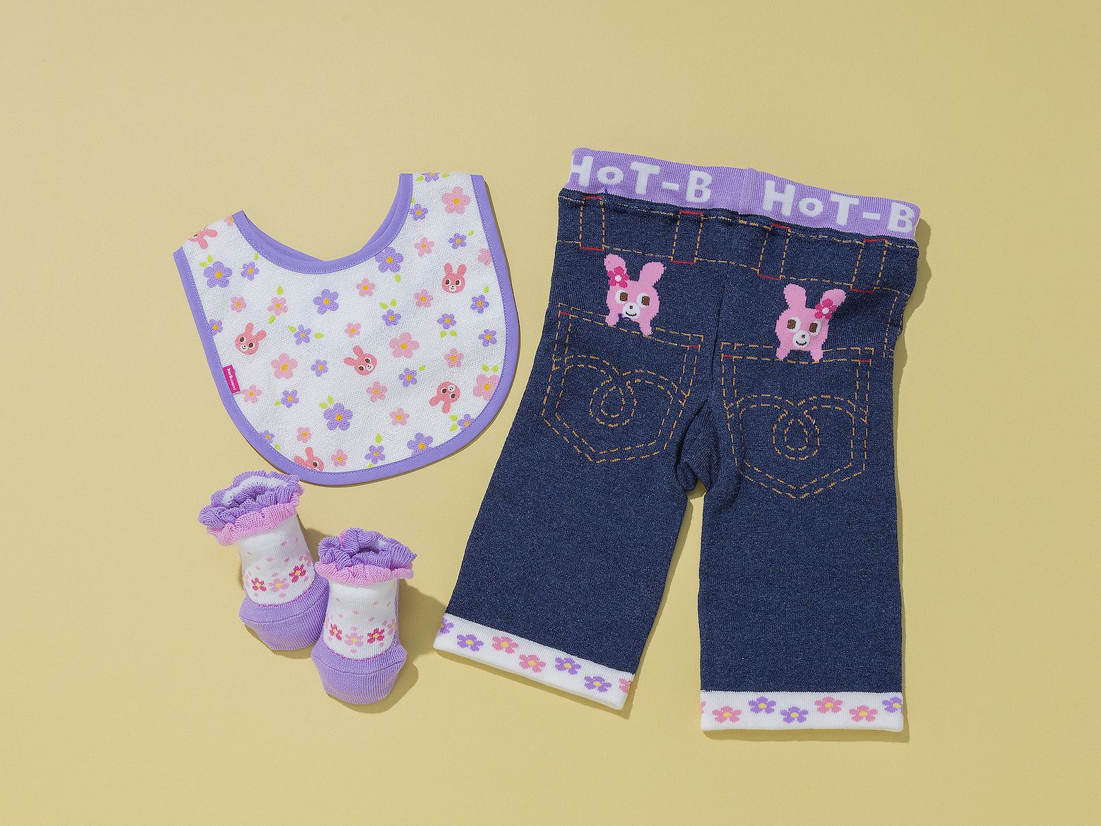 スパッツとスタイとソックスがセットになった、小物ギフトセットです。スパッツのおしりには、ドライブビーンズくんと、ポケットに入ったキャビットちゃんがダブルでドン!ベビーちゃんの可愛らしさを引き立てるキャラクターたちの大柄アイテムはギフトにもピッタリです。