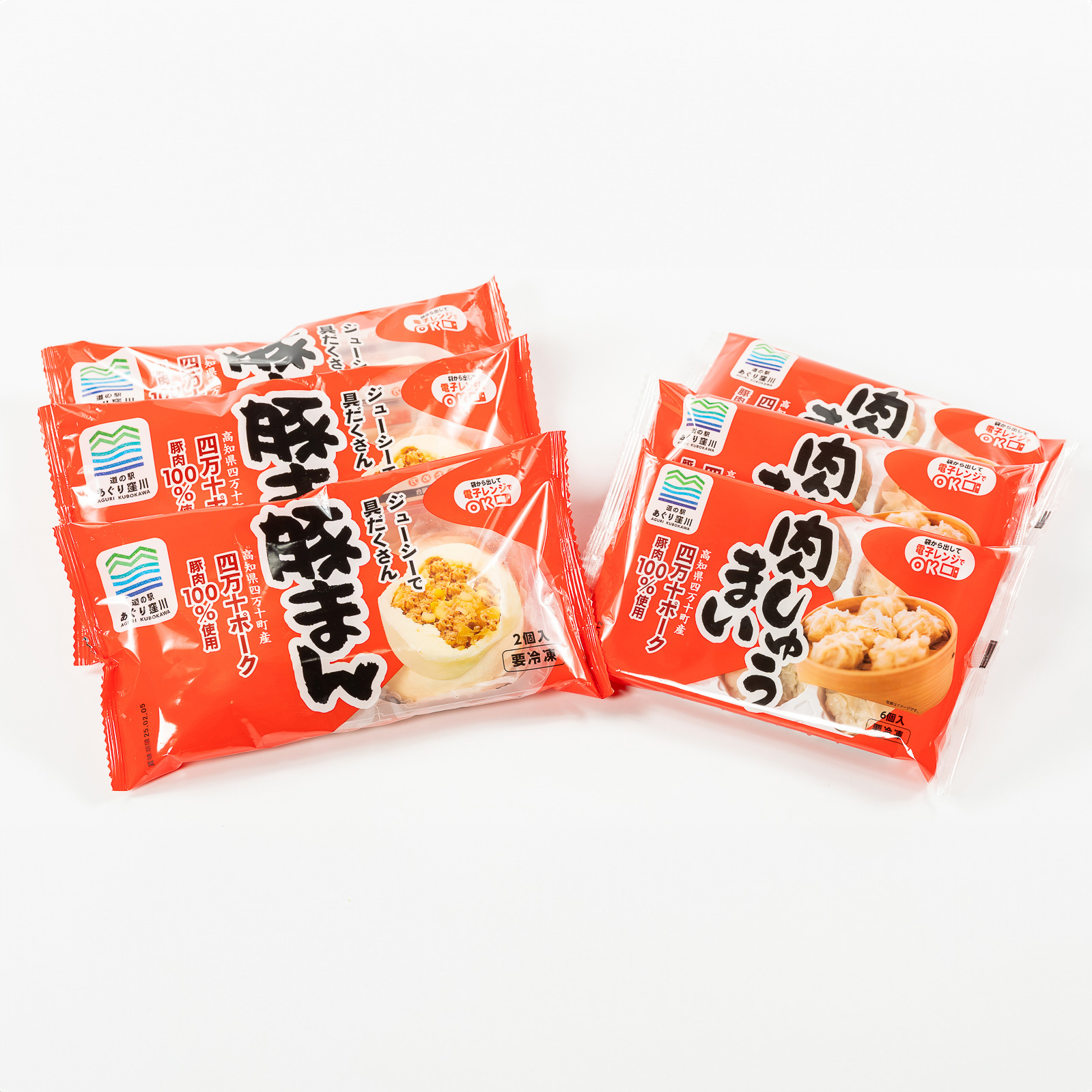 豚まん: ブランド豚「四万十ポーク」は とても柔らかく甘みが強いのが特徴です。 味付けは四万十ポークの甘みと、玉葱の甘みの 素材の味と醤油ベースの特性タレを 活かしたものとなっております。 四万十ポーク、国産玉葱、高知県産竹の子を使用した具材を しっとりとした皮で包んでます。 肉しゅうまい: 四万十ポーク、国産玉葱、生産量日本一の高知県四万十町産生姜を使用し、 こだわりの具材を薄皮で包みました。 四万十ポークの甘みと玉葱の甘みの素材の味を活かした味付けに 生産量日本一の四万十生姜がいいアクセントです。