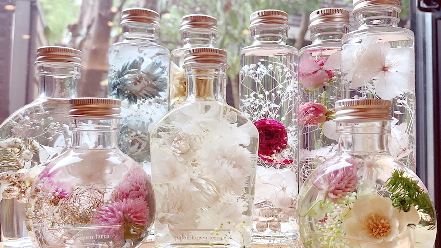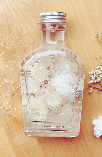 サロンの名前にあるグリーンは色としての緑というだけでなく、自然という植物全体の広い意味を込めました。 花は儚くもすぐに散ってしまいますがだからこそ、その一瞬の美しさにはっと目を奪われます。 美しいその瞬間を忘れないように新しく生まれ変わったハーバリウムは長くあなたのそばで輝き続けますグリーンテラスでは庭先にある身近な植物をとりいれながら自然本来の美しさを壊さずに長い期間、愛でていただける作品づくりを心がけています。 枯れることのないあなたの気持ちをハーバリウムにこめて一つ一つ丁寧に心をこめて手作りしています