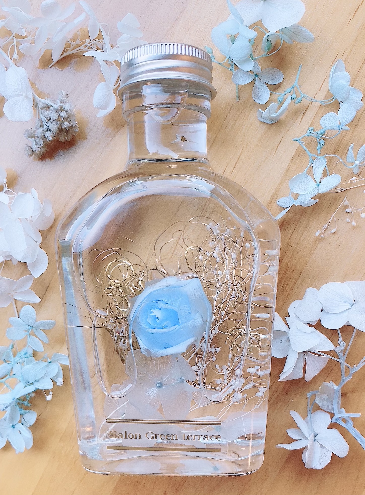 サロンの名前にあるグリーンは色としての緑というだけでなく、自然という植物全体の広い意味を込めました。 花は儚くもすぐに散ってしまいますがだからこそ、その一瞬の美しさにはっと目を奪われます。 美しいその瞬間を忘れないように新しく生まれ変わったハーバリウムは長くあなたのそばで輝き続けますグリーンテラスでは庭先にある身近な植物をとりいれながら自然本来の美しさを壊さずに長い期間、愛でていただける作品づくりを心がけています。 枯れることのないあなたの気持ちをハーバリウムにこめて一つ一つ丁寧に心をこめて手作りしています