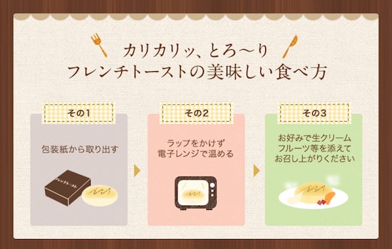 保存する場合は冷凍保存で。お召し上がりいただく際には、まず包装紙から商品を取り出します。ラップをかけずに電子レンジで温め(600w1分30秒)ます。まるでお店で注文した出来たてのように、あつあつのフレンチトーストが堪能できます。
