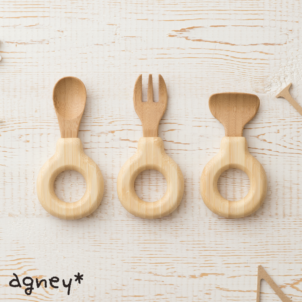 agney*の「わっかのカトラリー」3本セットです。丸い見た目がキュートなわっかのカトラリーが、お得なセット商品になって登場しました。愛着のわくデザインで、お子様の食事をサポートします。オリジナルギフトボックスに入れてお送りします。