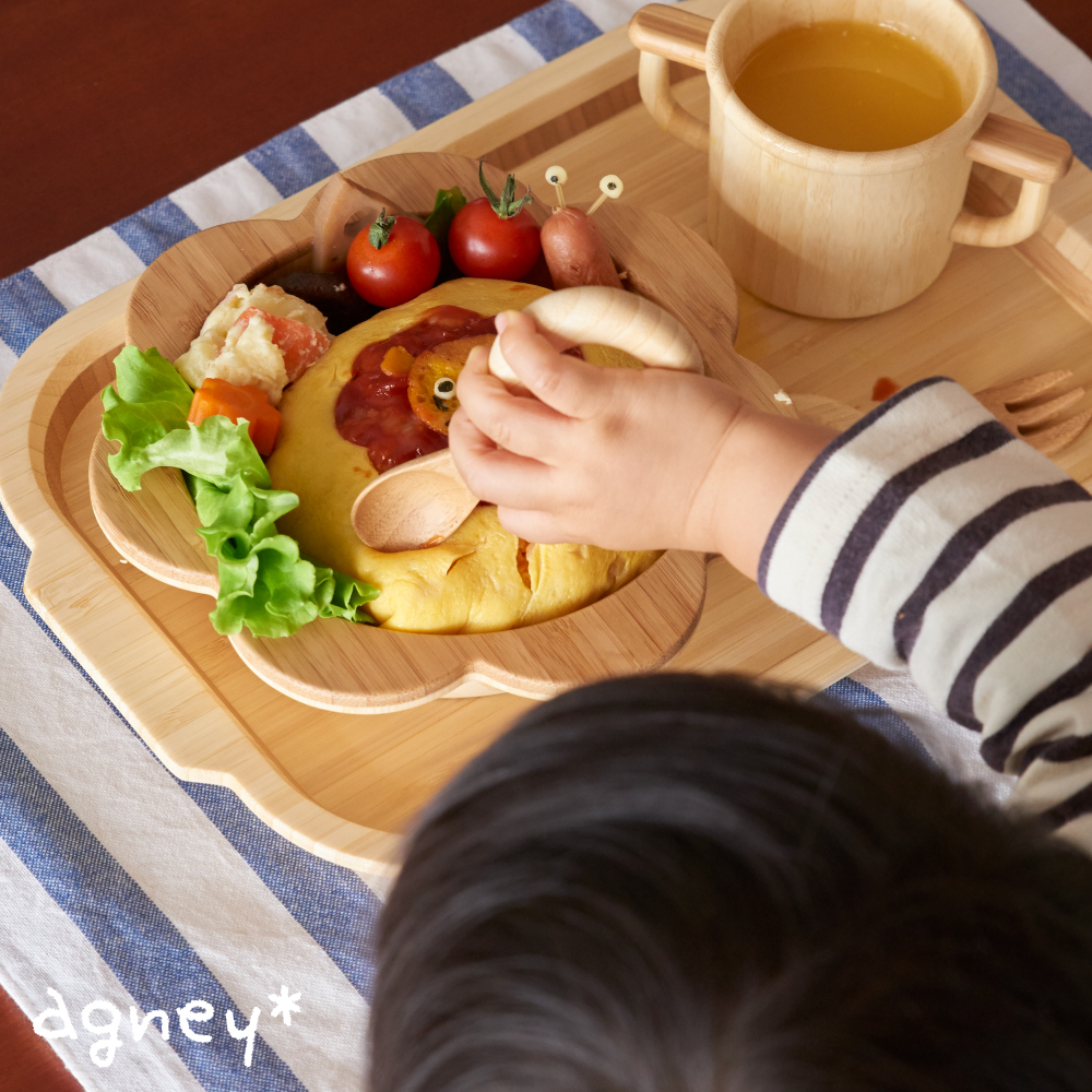 幼児期のうちに天然素材にたくさん触れることは、 子供たちの安定した豊かな心の成長・思考にとっても良い効果があるのだそうです。 毎日、小さな手で、口で直接触れる食器もそのひとつ。 agney*(アグニー)の天然素材の食器は、 優しいぬくもりをそっと伝えます。