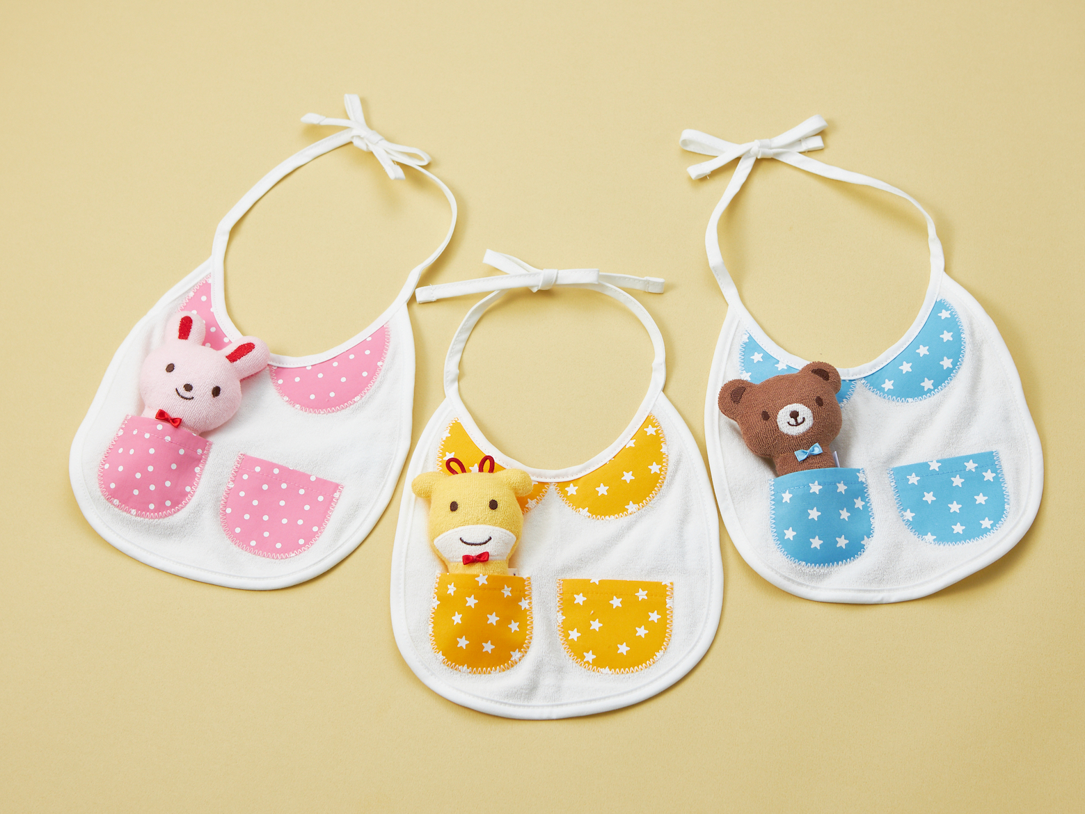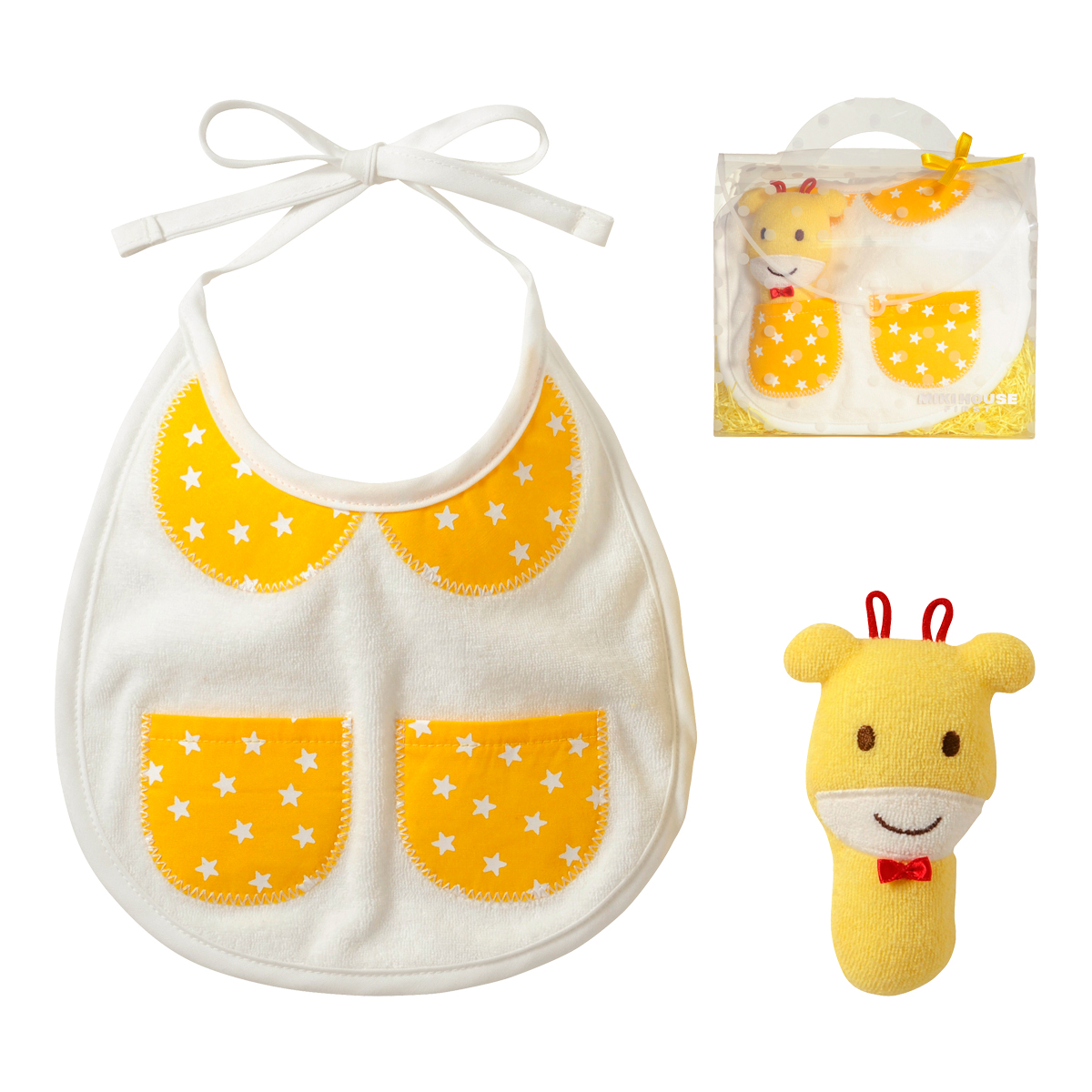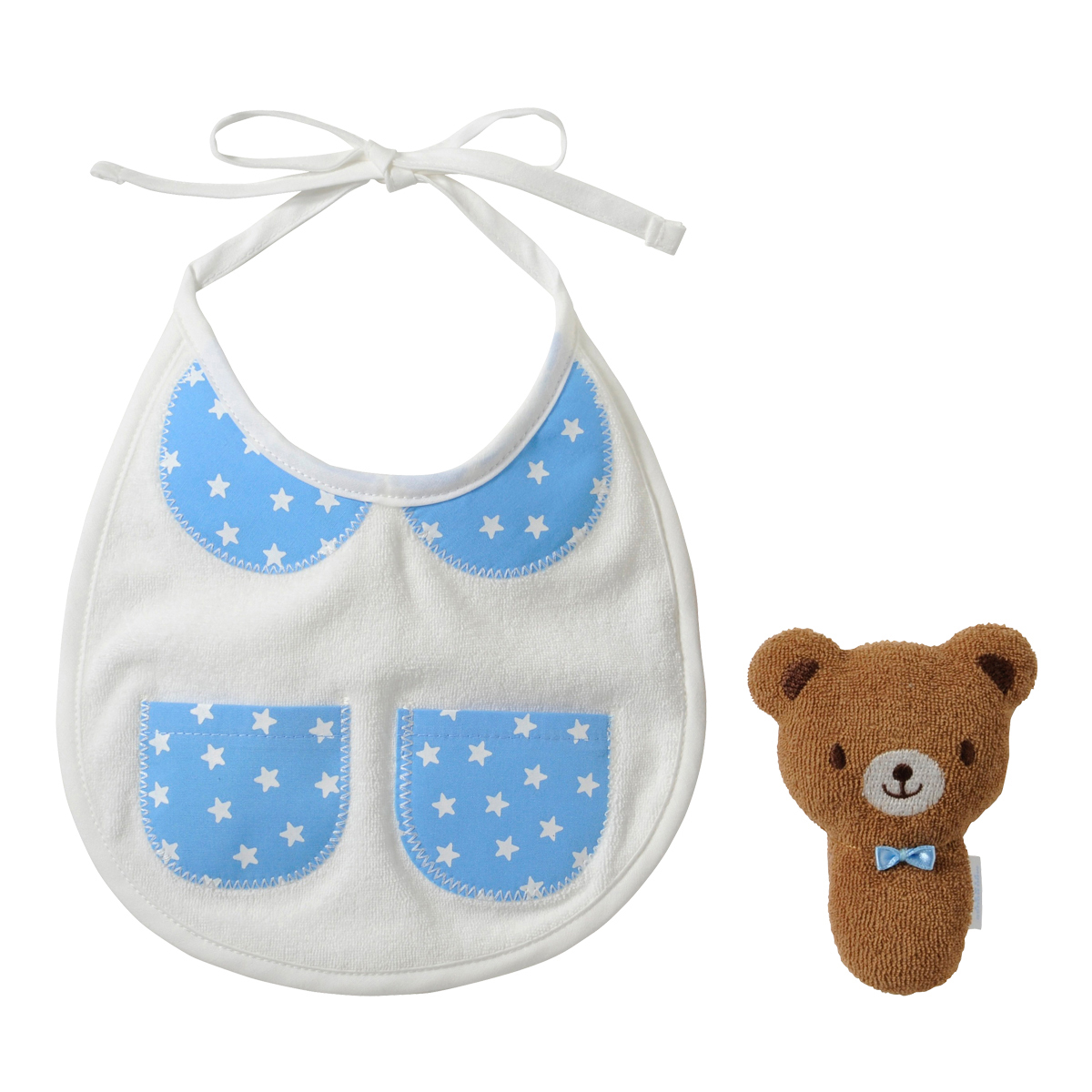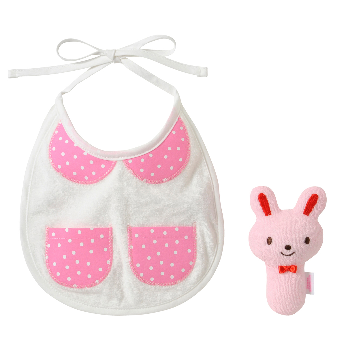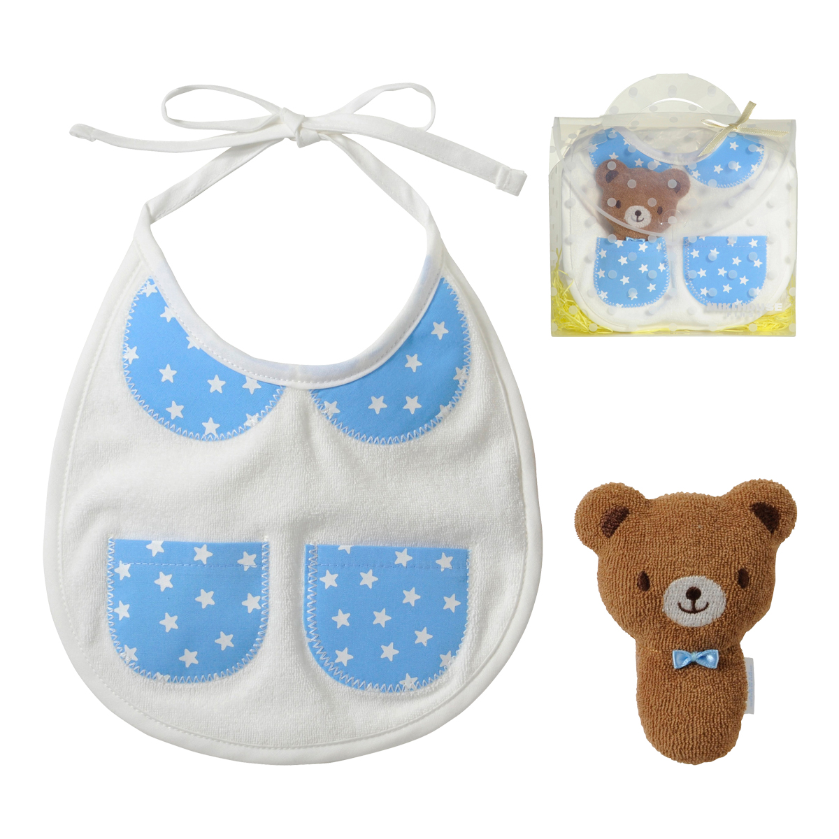 大口注文・法人のお問い合わせはこちらまるで、おとぎ話にでてきそうなミニポケット付きの丸襟風の刺繍がついたスタイと 赤ちゃんの初めてのおもちゃにぴったりなカワイイどうぶつラトル。御出産祝いの定番のスタイとラトルがセットになった嬉しいギフトセットです。 スタイに刺繍された丸えりとミニポケットは、ベビーちゃんならではの可愛さ!おでかけするのも楽しみになっちゃいますね!ミニポケットにラトルをいれて、ラトルと一緒にお出かけしましょう!スティックタイプのラトルは握りやすく、やさしい鈴の音にベビーちゃんの笑顔も絶えませんね!