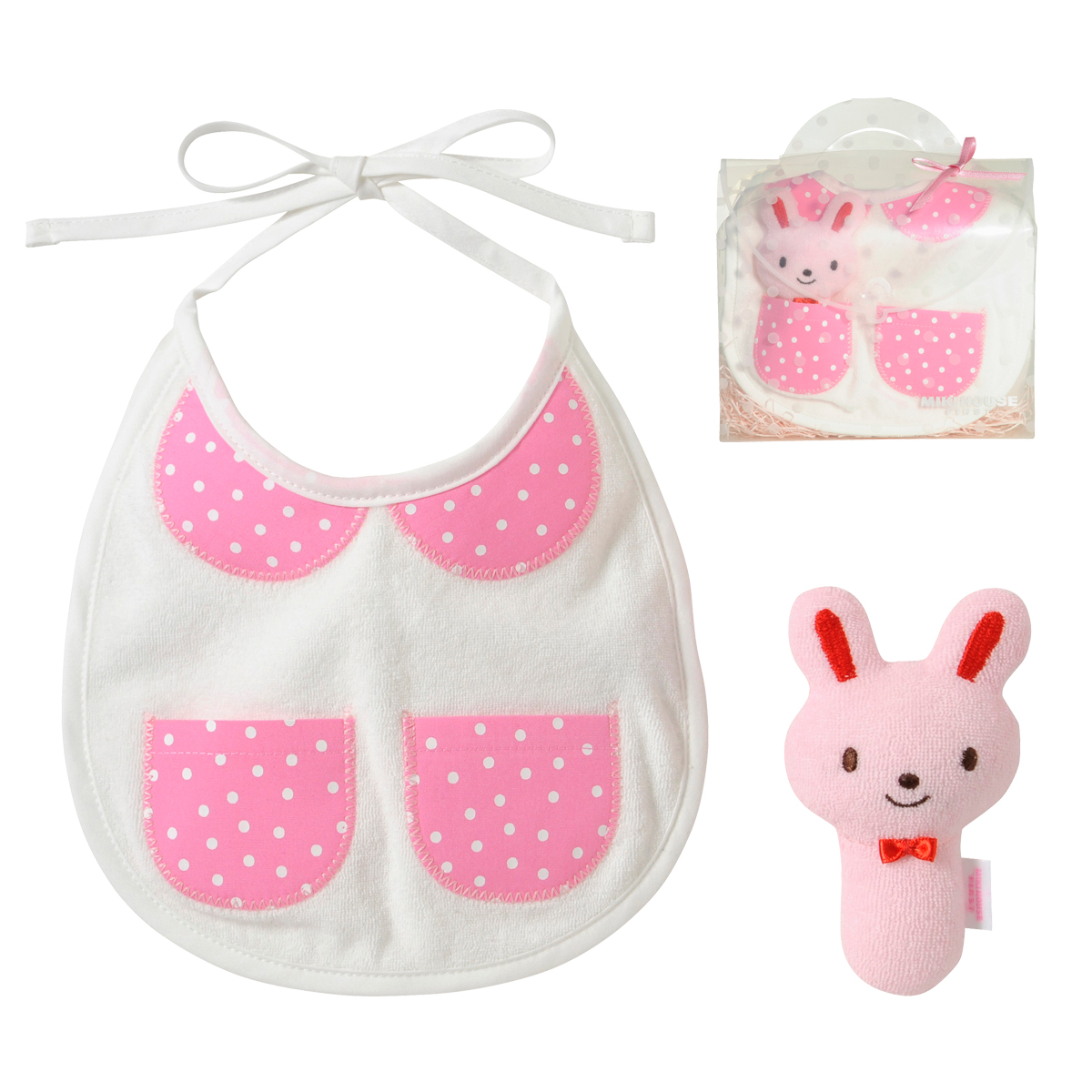ドット柄のクリアケースつきのスタイ&ラトルのセットです。