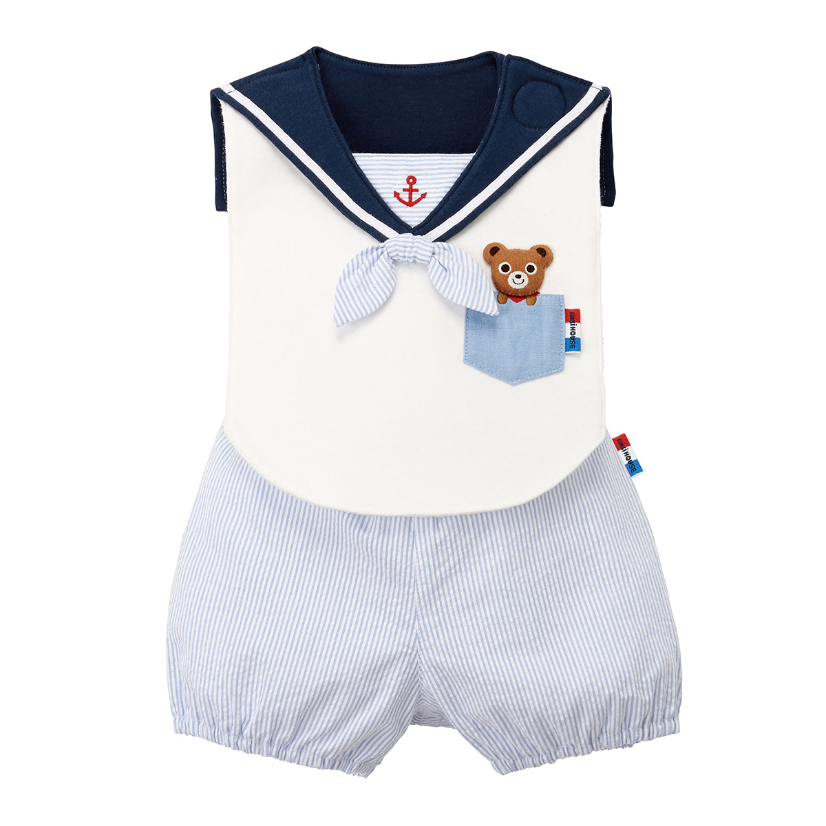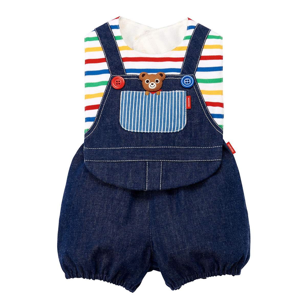 | 品質 | <材質> (白) スタイ:(表地)40/-スムース(ポケット部分)ダンガリー(ストライプ部分)先染サッカーストライプ(裏地)コーティングパイル ブルマ:先染サッカーストライプ (マルチカラー) スタイ:(表地)40/2天竺ボーダー(ストライプ部分)ヒッコリー(オーバーオール部分)6オンスデニム(裏地)コーティングパイル ブルマ:6オンスデニム <品質> スタイ:(表地)綿100%(裏地)綿80%、ポリエステル20%(ポリウレタンフィルムコーティング) ブルマ:綿100% |