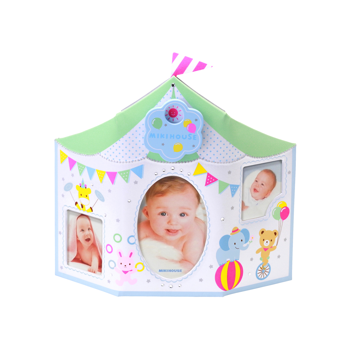 遊園地をモチーフにとっても可愛いフォトフレームです。巻きネジのオルゴールがついていて、癒しの空間を醸成します。お花型の巻きネジを回すと、オルゴールがのぜんまいが巻かれて、カノンのメロディーが優しく響きます。ギフトにもおすすめです。