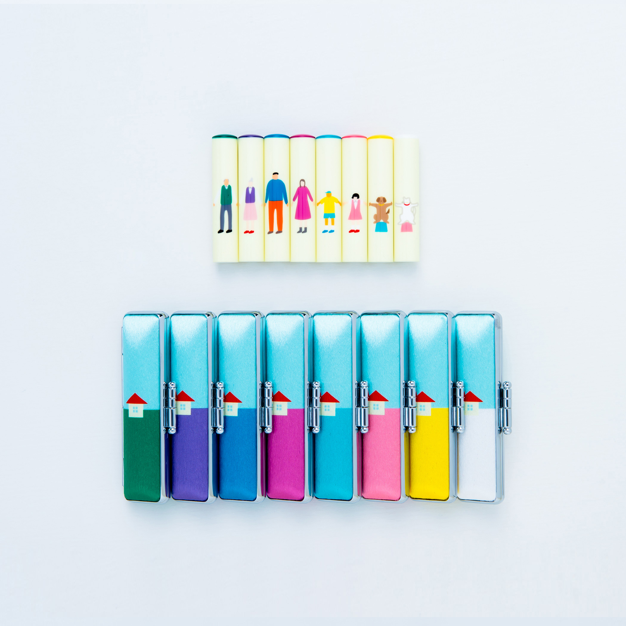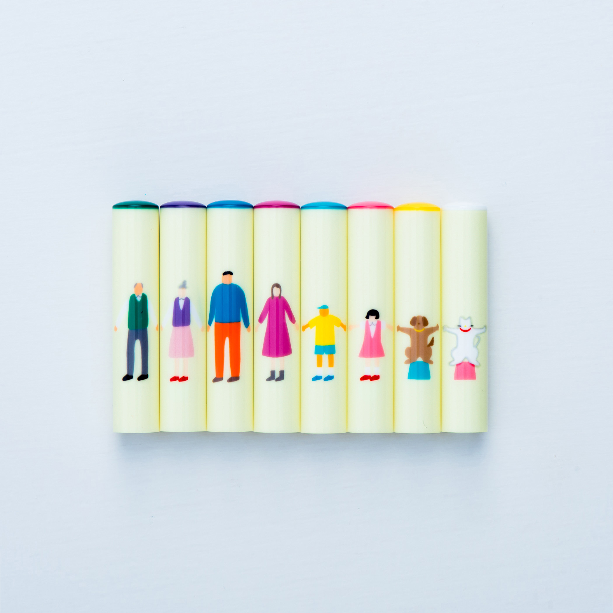 結婚して名前がおそろいになったことを祝して、ペア印鑑と「結婚生活に向けた約束」が刻印された印鑑ケースセット「おそろいんかん」。 手つなぎは「家族の絆」をモチーフにした樹脂製の印鑑です。 印鑑には祖父から猫ちゃんまでご家族全員が手をつないでいるデザイン。 印鑑ケースには一家を表現したお家が描かれています。 印鑑ケース内部には、結婚生活に向けて夫婦で決めた約束・記念の言葉を印字することができます。 祖父、祖母、父、母、息子、娘、犬、猫の8柄からお選びください。 入籍したふたりのおそろいの記念として、新しい家族への贈り物として、ご家族みんなが繋がるおそろいの小物として. 結婚した友達へのお祝いとして等、ギフトとしてもお使いいただけます。