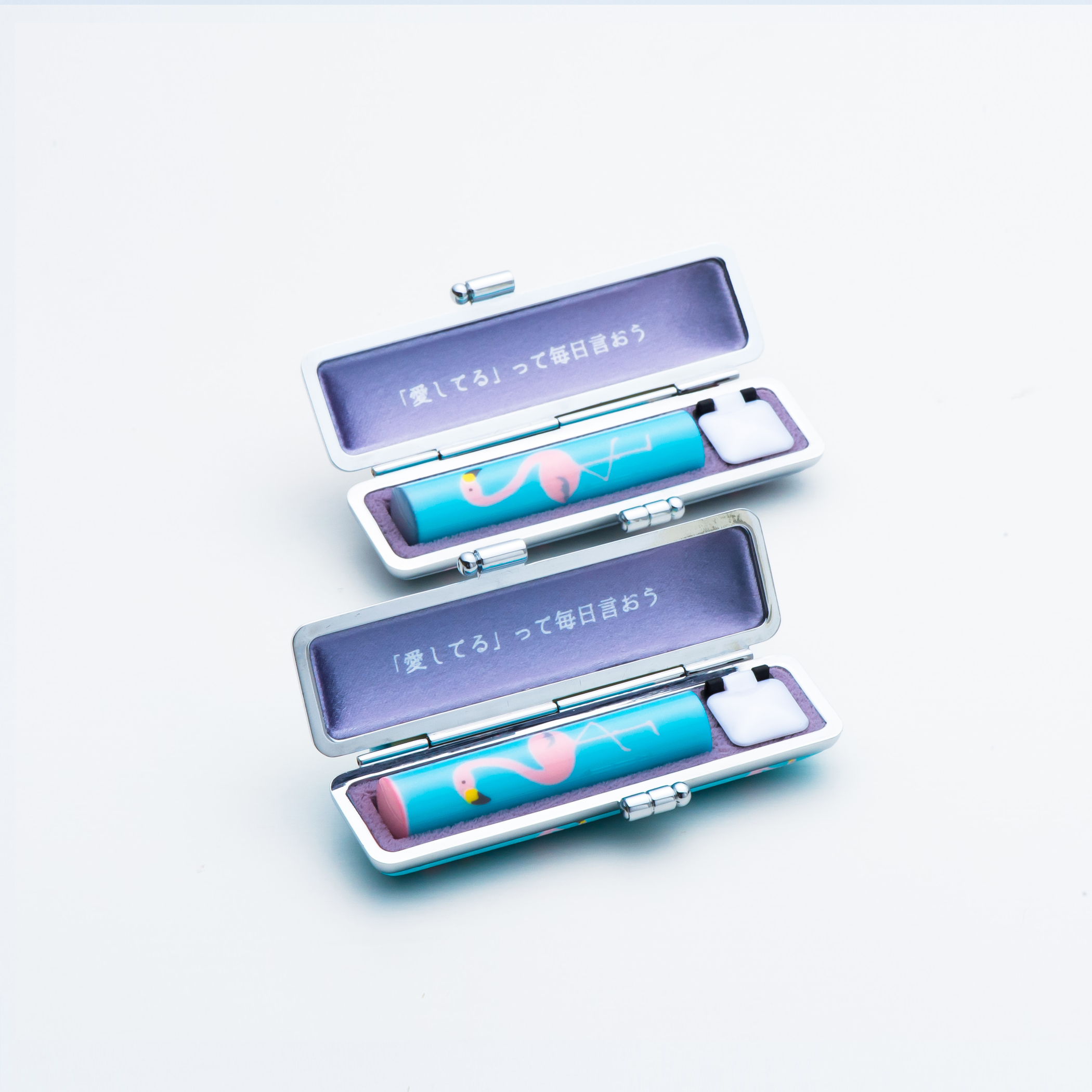 大口注文・法人のお問い合わせはこちらフラミンゴは「幸福の鳥」をモチーフにし、 印鑑を2本並べると二羽の首がハートの形になるデザインの樹脂製の印鑑です 印鑑ケース内部には、結婚生活に向けて夫婦で決めた約束・記念の言葉を印字することができます。 アイスグレー、ターコイズブルーの2色からお選びください。 入籍したふたりのおそろいの記念として、新しい家族への贈り物として、 結婚した友達へのお祝いとして等、ギフトとしてもお使いいただけます。