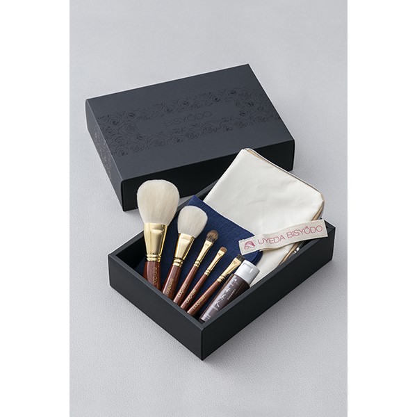 ポーチ、100%コットンのBISYODOタオル、化粧筆用洗浄剤のNew筆美人30mlもセットに含まれています。