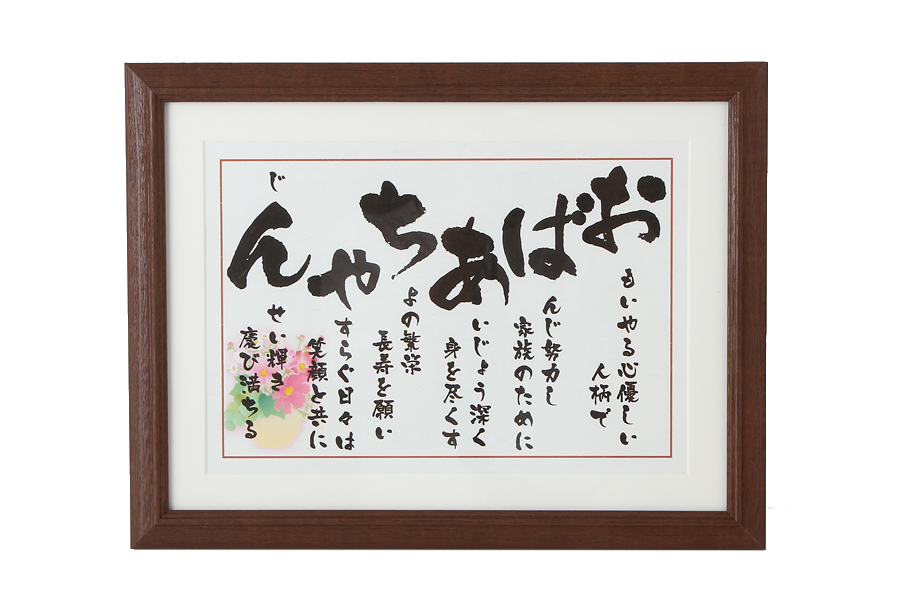 大口注文・法人のお問い合わせはこちら「お・ば・あ・ち・ゃ・ん」の文字に日頃の感謝の気持ちを込めて。 ・かわいい【コスモス】の挿絵がワンポイントのアクセントになっています。 ・額の大きさは約28センチ×37センチで、 ブラウンの木製枠になります。