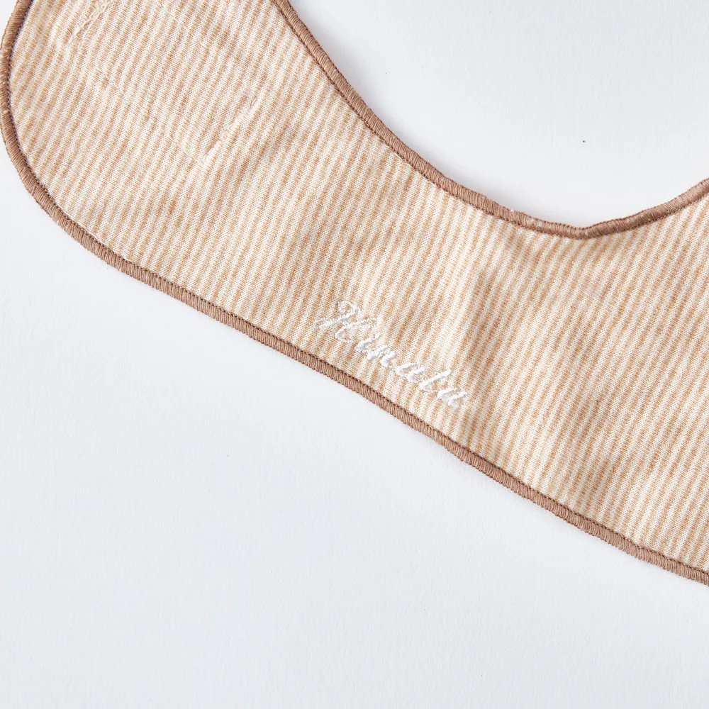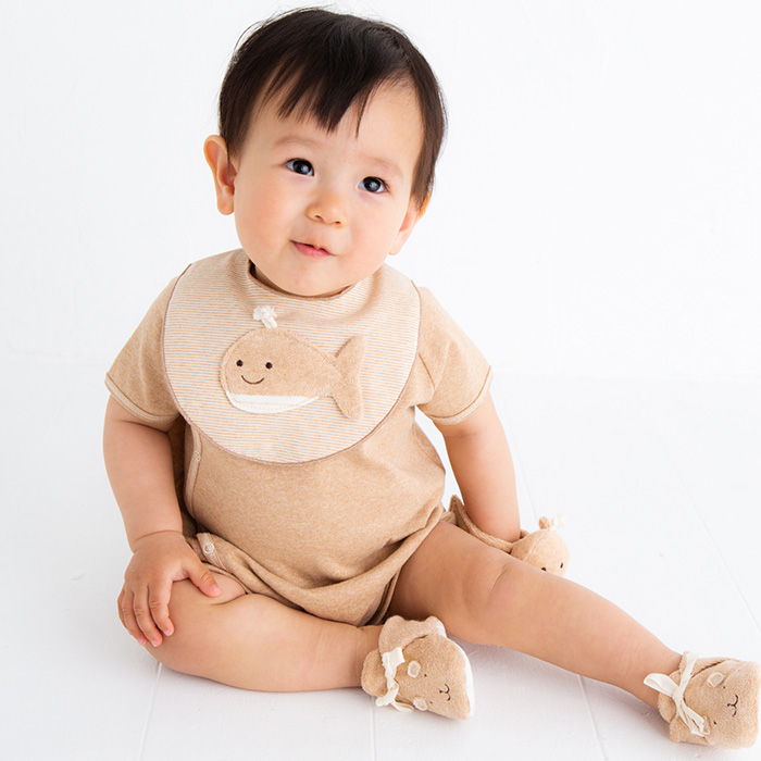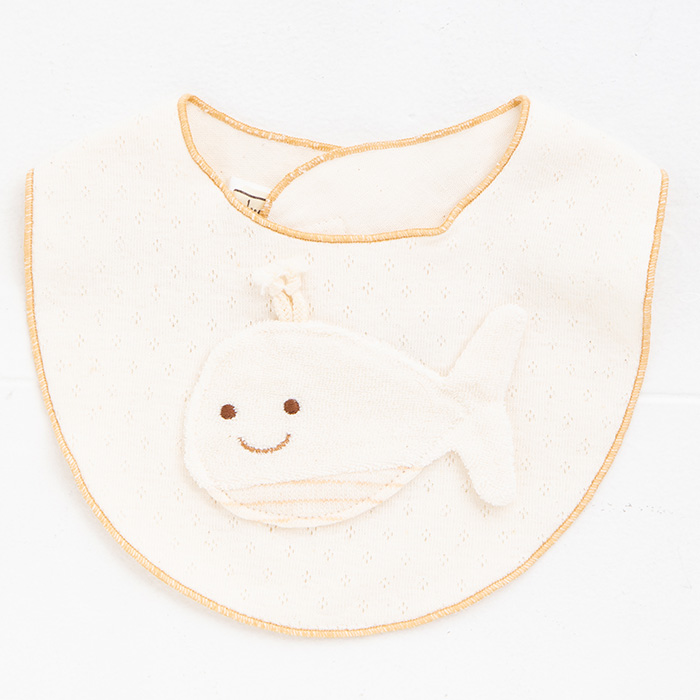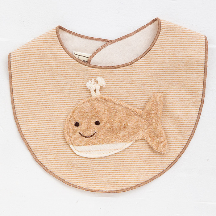 普段使いに便利な小さめスタイです。ナチュラルはやさしい透かし柄のフライス、ブラウンには細ボーダーの天竺をベースに、半立体のくじらモチーフが付いています。うしろについているマジックテープで、首廻りの調節も出来ます。ご自宅用にも、出産祝いの贈り物にもおすすめです。