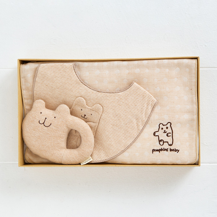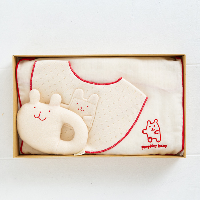| サイズ | スタイ 縦16㎝×横19㎝ ガラガラ 縦8㎝×横12㎝×厚さ4㎝ ハンカチ 縦27㎝×横27㎝ |