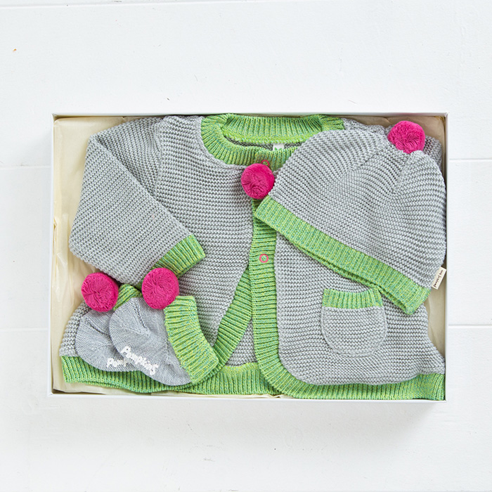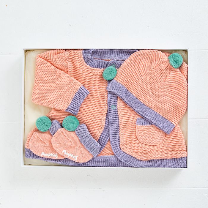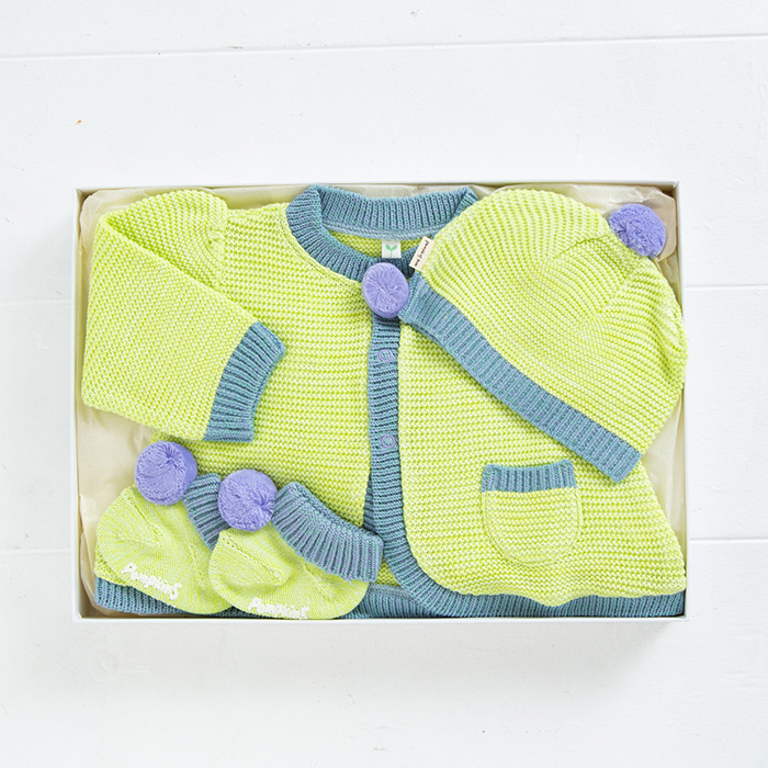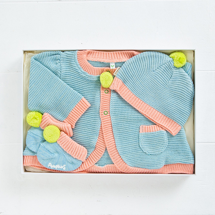 カラフルで大きなボンボンが付いた見ているだけでハッピーな気持ちになるカーディガン、キャップ、ソックスとあったら嬉しいが詰まったギフトセットです。カラフルで大きなボンボンがついた、ソックス・キャップ・カーディガンの3点セットです。色の配色が目を引きます。