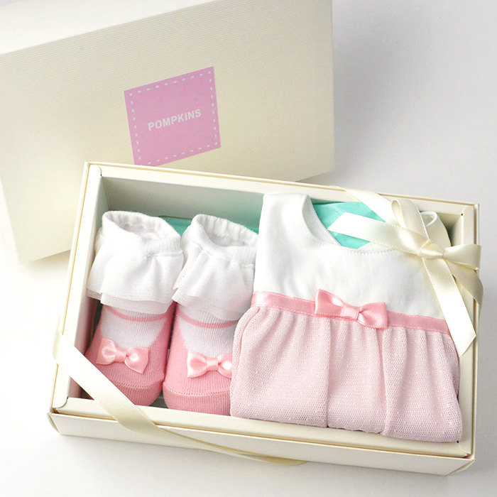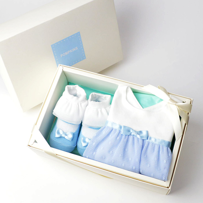 まるでフォーマルなドレスを着たかのような素敵なスタイ。段々フリルがゴージャスです。チュールのバレエシューズ風POP UP SOXが一緒になったギフトセットです。結婚式やお宮参りにもおすすめです。星柄がキラキラかわいい、オリジナルギフトボックスに入っています!