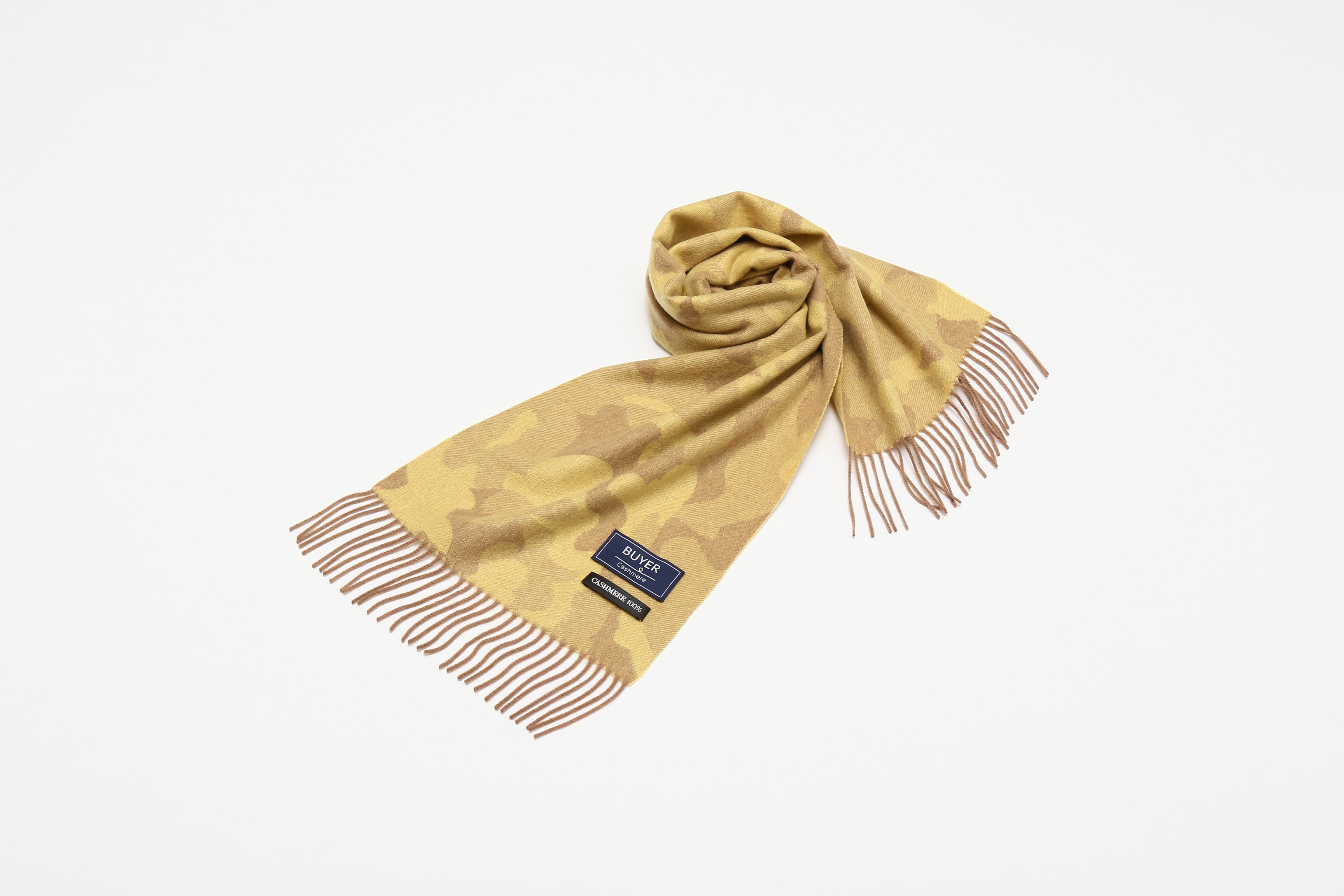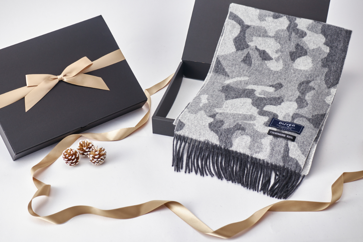 カシミヤを100%使用した、BUYER(バイヤー)のジャカード織のミリタリーマフラーです。特殊な織機を使用するので手間暇がかかり、世界的に生産数が少なく貴重な製品となります。高品質に加えおしゃれなデザインとなっており、贈り物として喜ばれること間違いなしです。