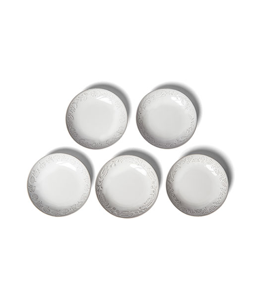 レリーフの柄が全て違う、小皿の5枚セット。 スウェーデン語で「くもり空」という意味を持つ「Mulet(ミュレット)」は、その名前の通り、白と灰色のニュアンスのある色合いが印象的なシリーズです。 ◆製造上の特性で、若干の個体差が生じやすいシリーズとなっております。個性としておたのしみください。 ・素材に含まれる鉄粉が浮き上がり、表面に黒点が現れます。使用上の問題はございません。 ・職人の手による釉掛けのため、濃淡や釉溜まりが出ます。黒土が透けてグレーとして表現されています。 ・持ち手の取り付けも一つ一つ手作業です。稀に取り付け位置が微少に上下する場合があります。 ・同じアイテムを複数梱包する際は、できる限りで風合いを揃えてお出しします。