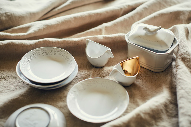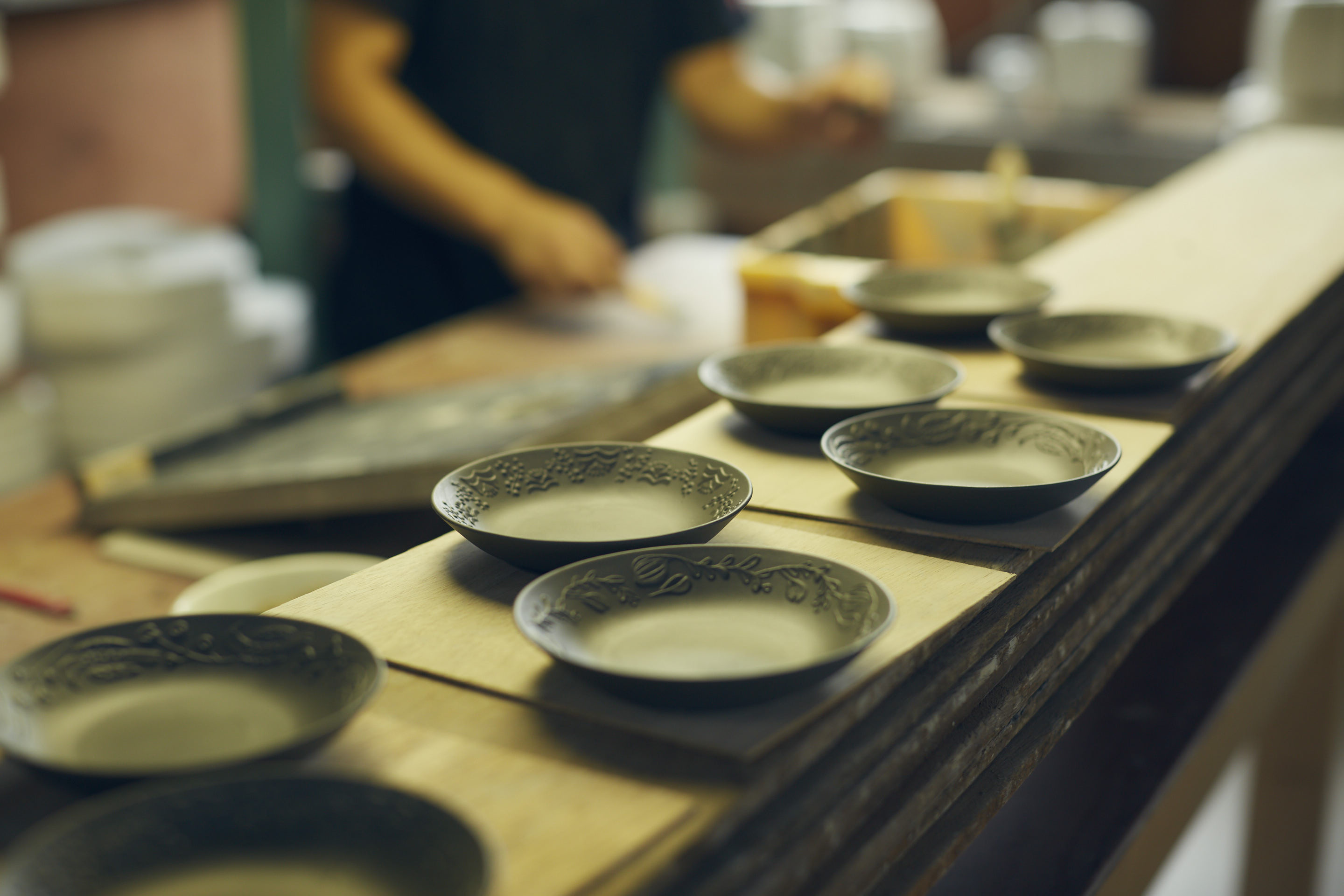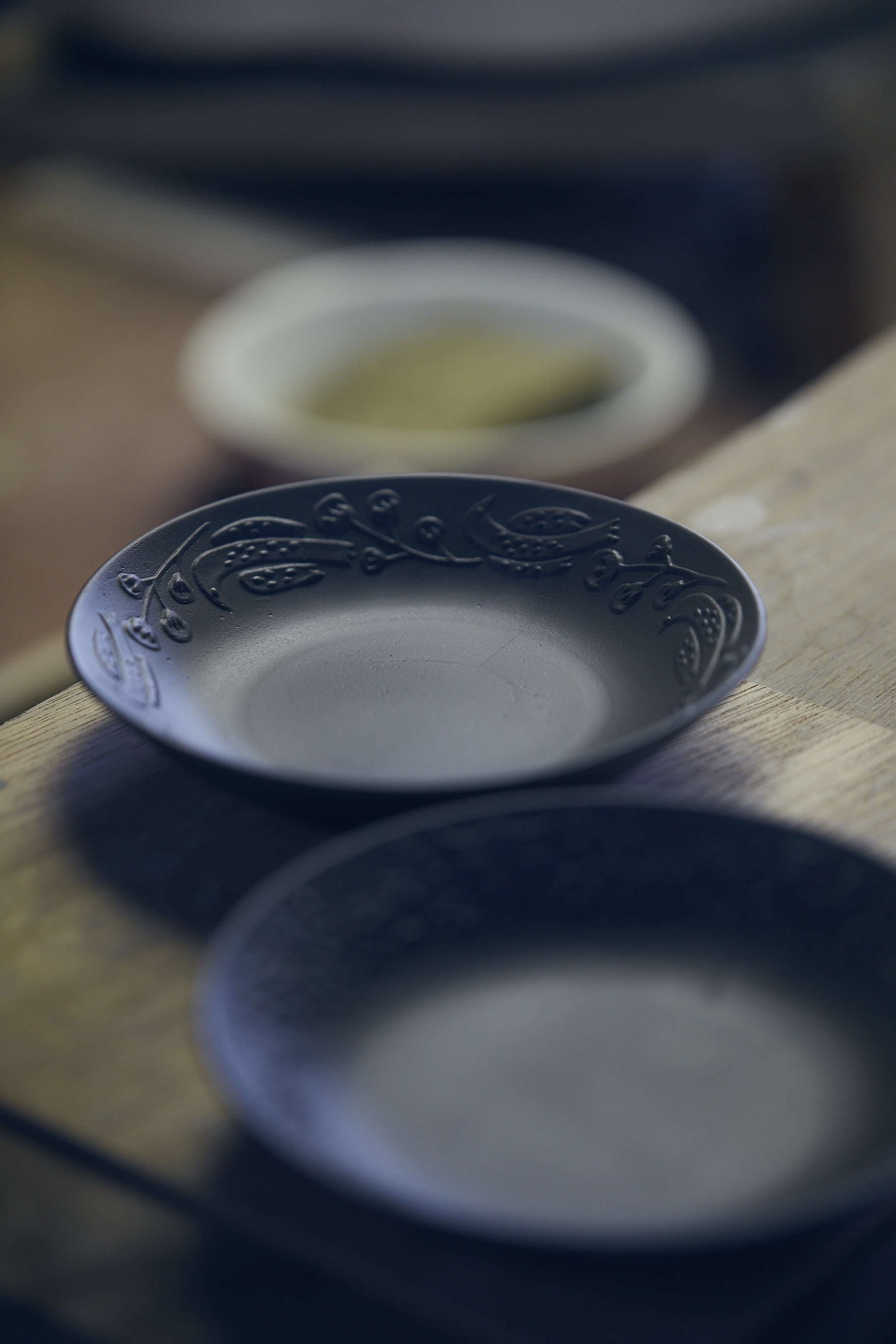 色合いだけ見ると、ともすれば冷たい印象を受けそうですが、Muletにはあたたかな雰囲気が宿っています。 それは、あえて1点1点少しずつ異なる形に仕上げた歪みのある形、釉薬の濃淡などから、手仕事の跡やぬくもりが伝わってくるから。 決して派手さはありませんが、お料理をそっと静かに引き立て、例えば異素材である木や金属、ガラスなどの器やカトラリーなどにもしっくりと馴染みます。