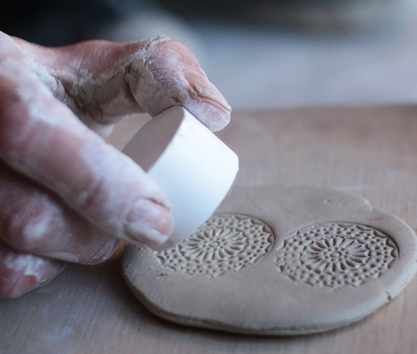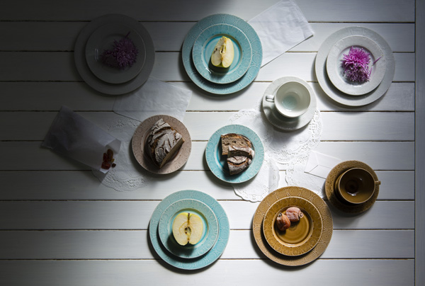 日本で古くから伝わる花の紋様刻印を押し付けて柄を作っていく「印花」という技法を利用し、釉薬の濃淡や手仕事の温かみを表現しています。 土素材と磁器素材を混ぜ合わせた柔らかな素材に、透き通るようなビードロの上薬を施し、細かなひび模様(貫入)の入るシリーズです。 ボディに入る刻印は、土原型に1点1点手作業で押印されているため、クラフト感の強い仕上がりになります。 使う素材と使用する技法は和の手法を、ベースとなる形は洋のテイストを取り入れながら、従来の洋食器にはない、オリエンタルな雰囲気が特徴のシリーズです。
