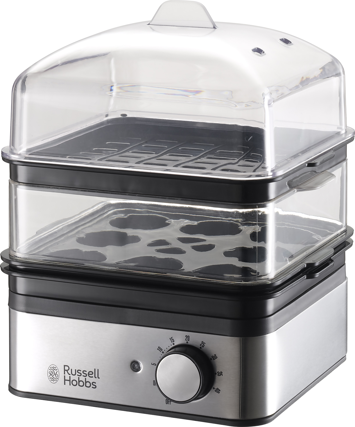 19㎝×19㎝の大きさ、すっきりとしたデザインは、キッチン、リビングに常に置いておいても気になりません。1段でも2段でも使用もできるので、単身者から家族まで対応できます。 卵を蒸すためのエッグトレイ付きなのでゆで卵作りもタイマーが見張ってくれます。空焚き防止機能も付いており、本体底面はコードの巻き取りが可能で収納も簡単です。