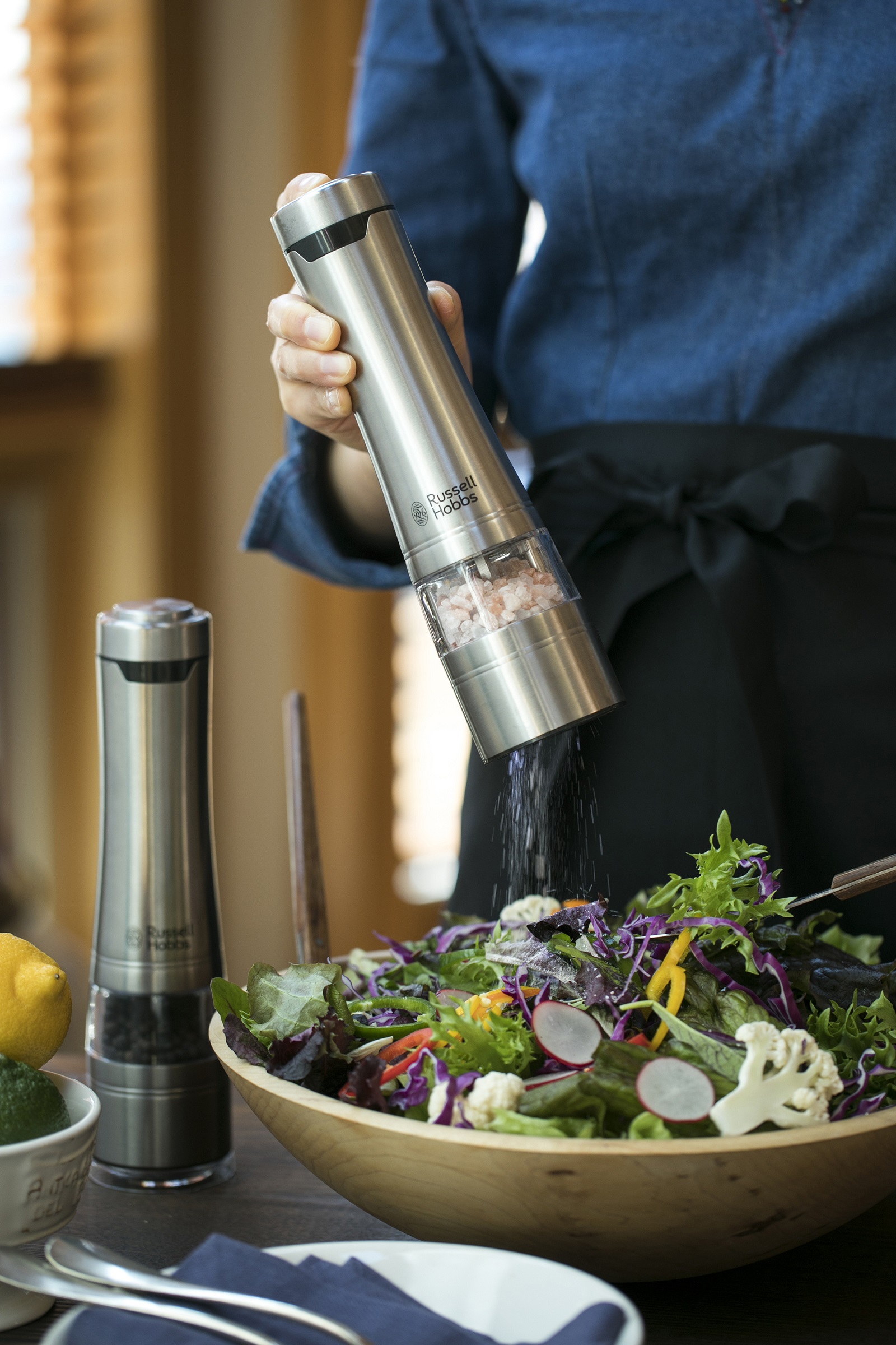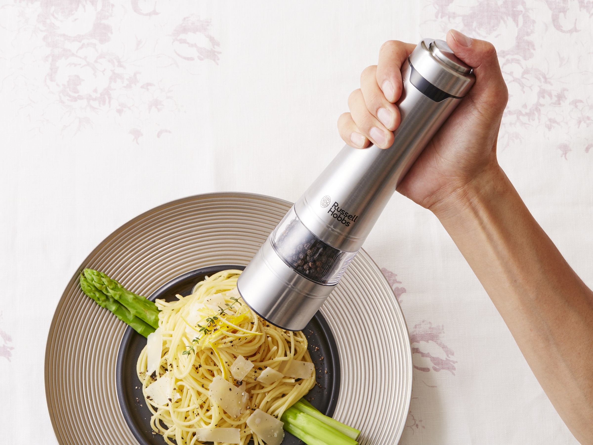 大口注文・法人のお問い合わせはこちら隠し味もスタイリッシュに、電動ミル ソルト&ペッパー。 ミル上部のボタンを押すだけで自動で挽くことができワンハンドで手早く料理の味を調えます。 片手で操作できるから、食材を混ぜたり炒めたりする手を休めずに使用することができ、テーブルをスタイリッシュに演出します。
