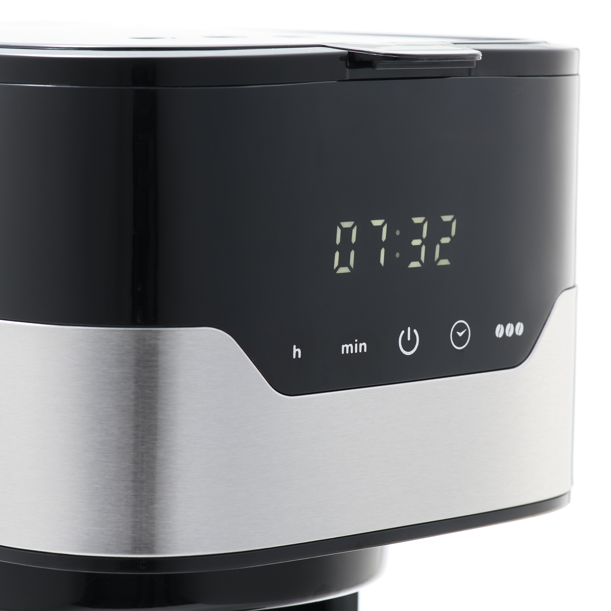 ・味と香りへの影響が少なく、豆本来の風味・甘みを味わえる、純金コーティングメッシュのゴールドフィルターも標準装備。 誰もが手軽に最高品質のコーヒーを楽しめる、新しいコーヒーライフを広げます。 ・全ての操作をタッチパネルに集約。ステンレスシルバーによるスマートなフォルムを実現しました。 幅、奥行き、高さとも程よいサイズ感で設計。 大容量のコーヒーメーカーでありながら、ダイニングやオフィスにスタイリッシュに溶け込みます。 ・濃いめで楽しみたい方は、ひとめでわかるアロマ機能をどうぞ。 コーヒー豆のアイコンランプの数で、お好みの味わいに調整できます。 ・タイマー機能付だから、飲みたい時間や来客の時間に合わせてセットできます。 また、抽出終了してから自動的に電源が切れるオートオフ機能もついています。 ・ステンレスカラフェは保温性高い二重構造。 淹れたての美味しさを長く保ちます。カラフェだけリビングや部屋に持ち運べば、どこでも温かなコーヒーを楽しめます。