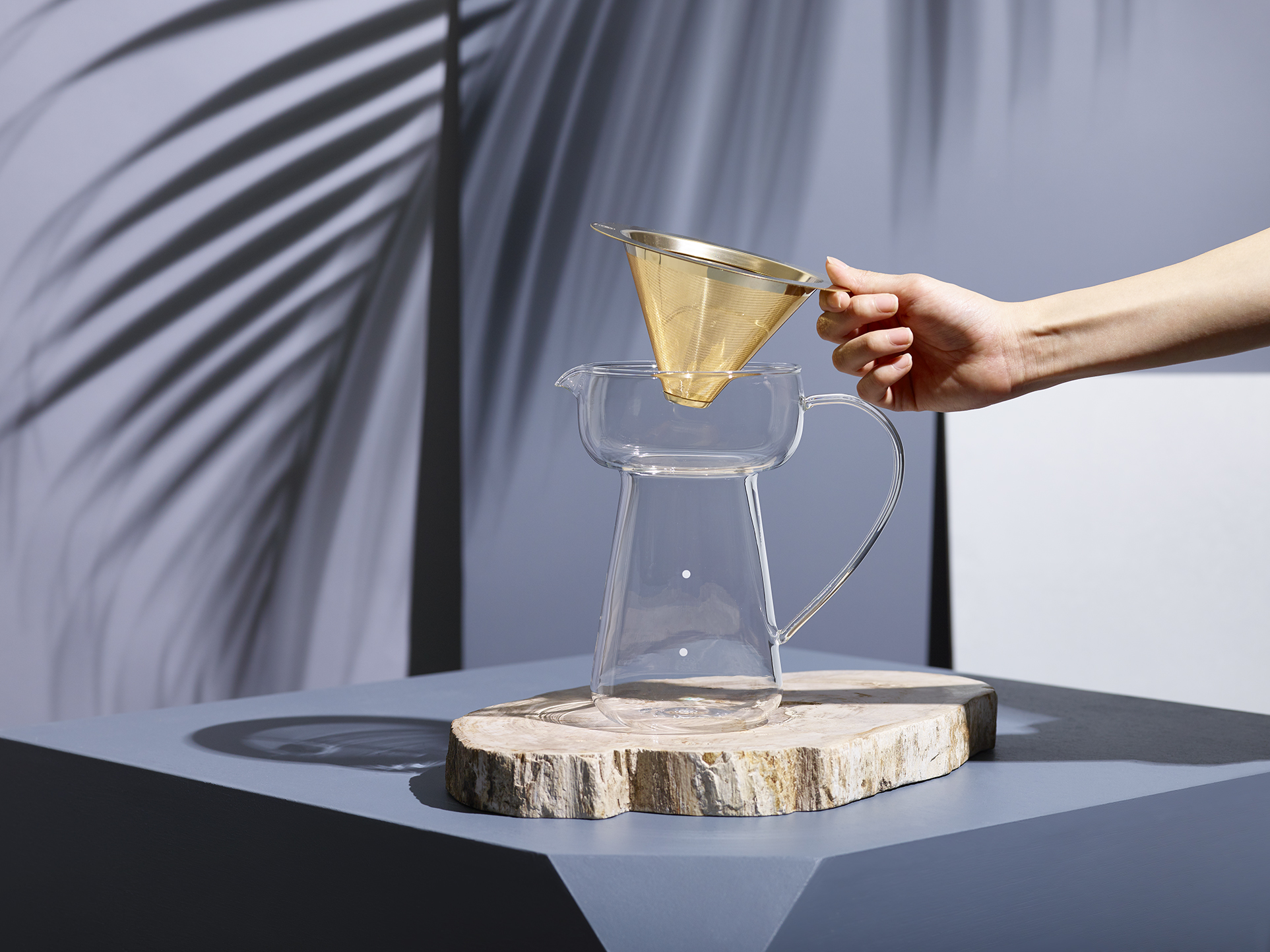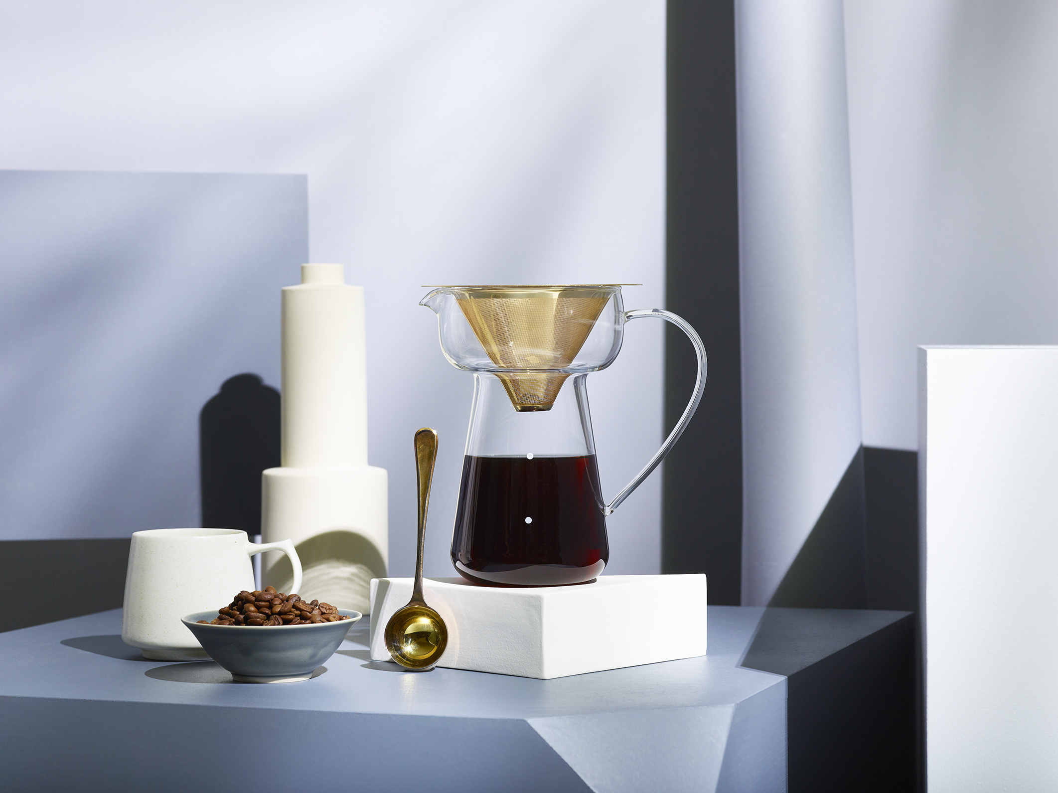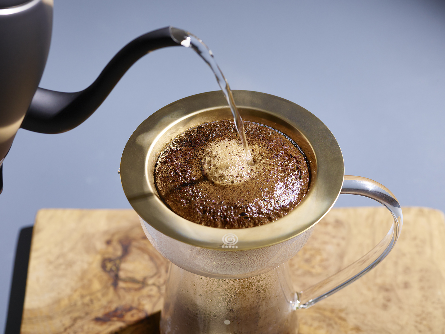 ドリップのひとときを、香りとともに。ドリップであふれるフレッシュなアロマを、より楽しむ為に設計された、コレス独自のゴールドコーンフィルター&サーバー。ドリップしていないときも、個性的で美しい存在感が空間を彩ります。