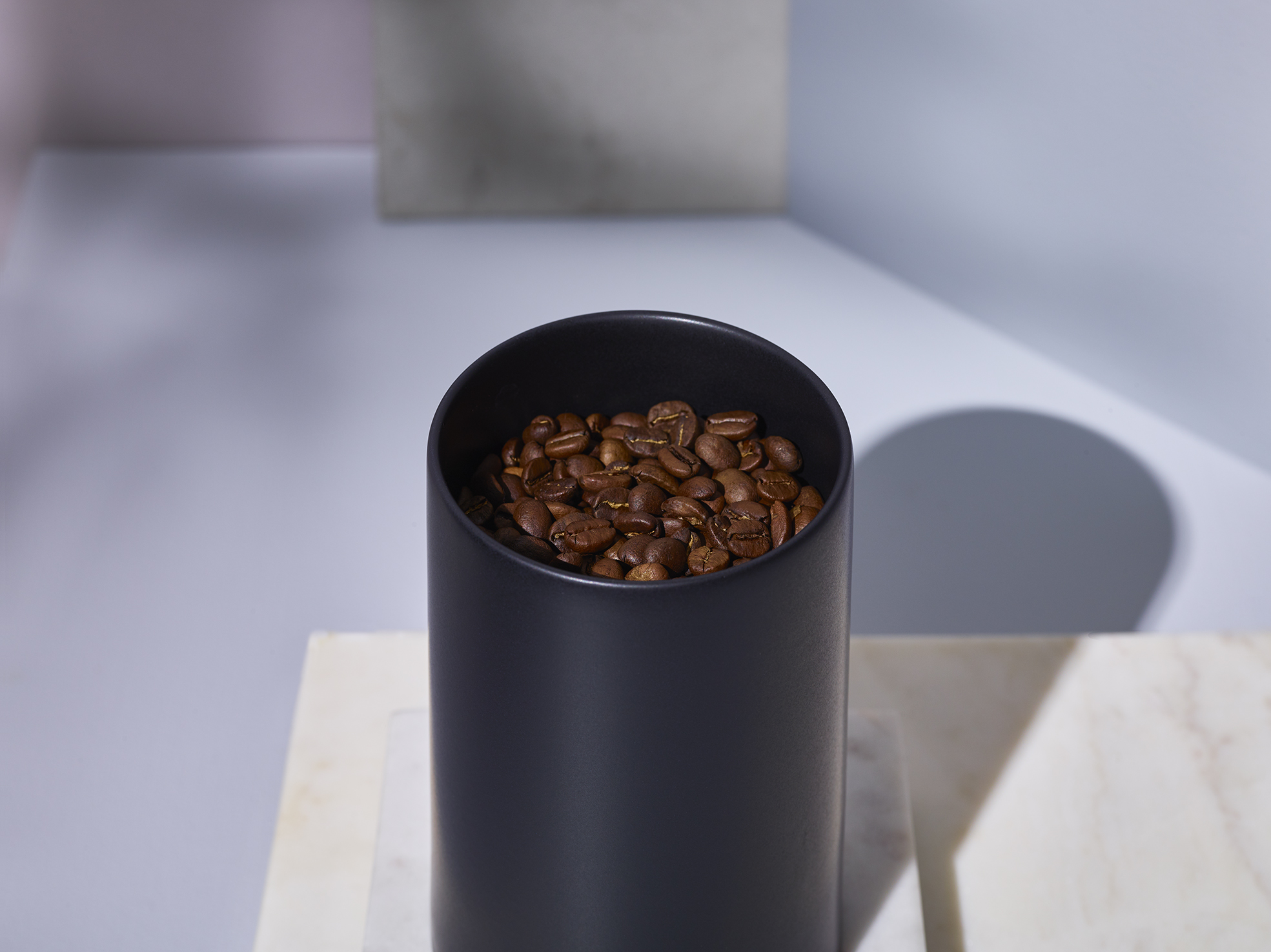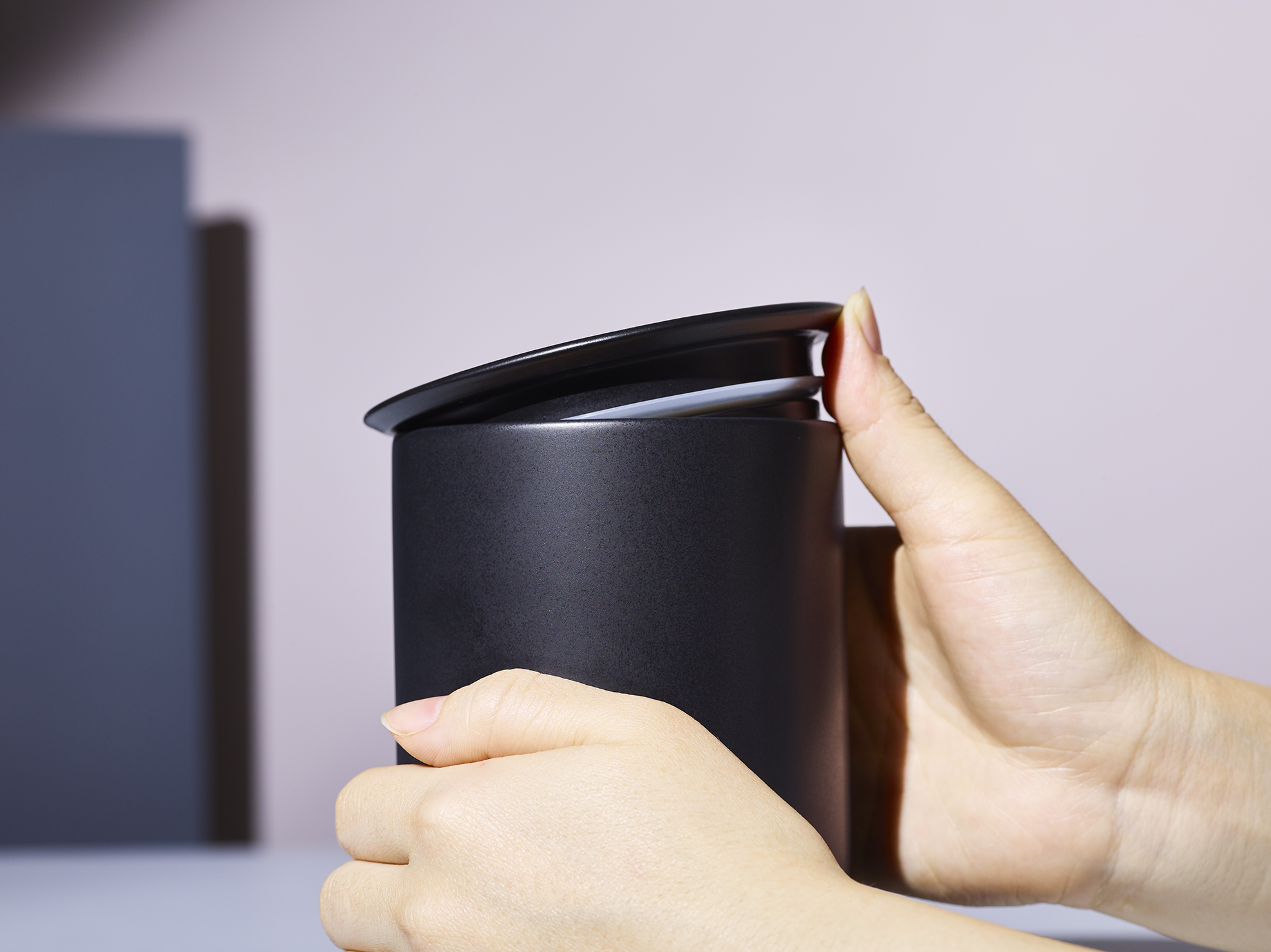 磁器は遮光性に優れ、フタにはパッキンが付いているので気密性も高く、保存に適したキャニスターです。 フタは段差のある形状でつかみやすく、指がかかりやすいから開けやすい。 フタまですべて同じ素材を用い、シンプルで直線的なフォルムに仕上げました。 温かみのある質感と相まって、落ち着いていながらも程よい存在感。 日々のコーヒーライフにふさわしい、飽きのこない佇まいを目指しました。