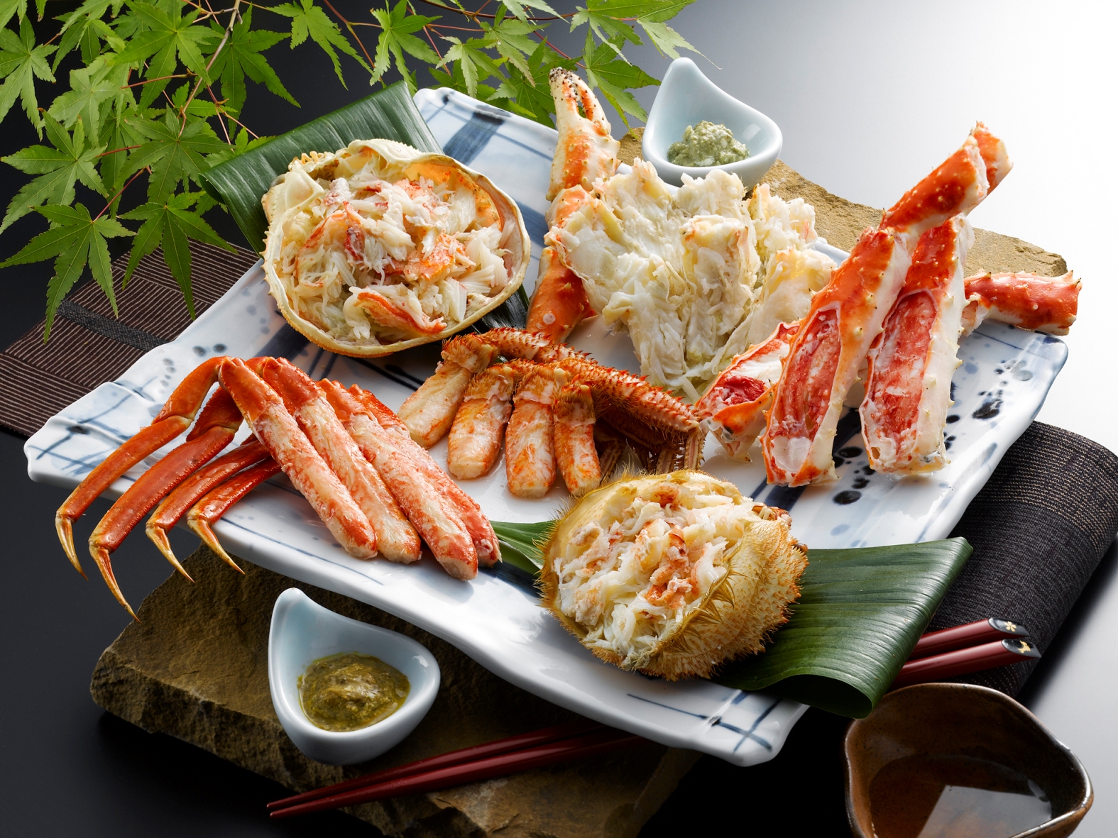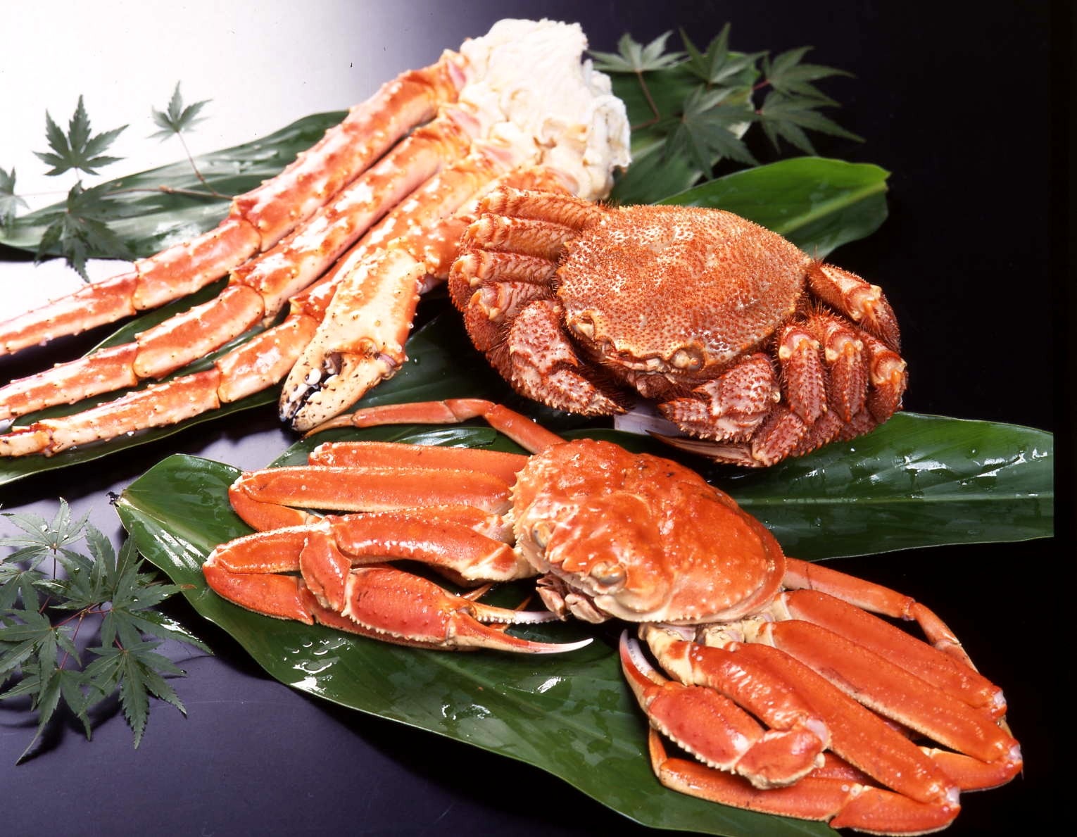 ずわいがにはプリプリの身と甘い蟹みそを、毛がには濃厚な身とみそを、たらばがには食べ応え十分な太い脚をご賞味ください。