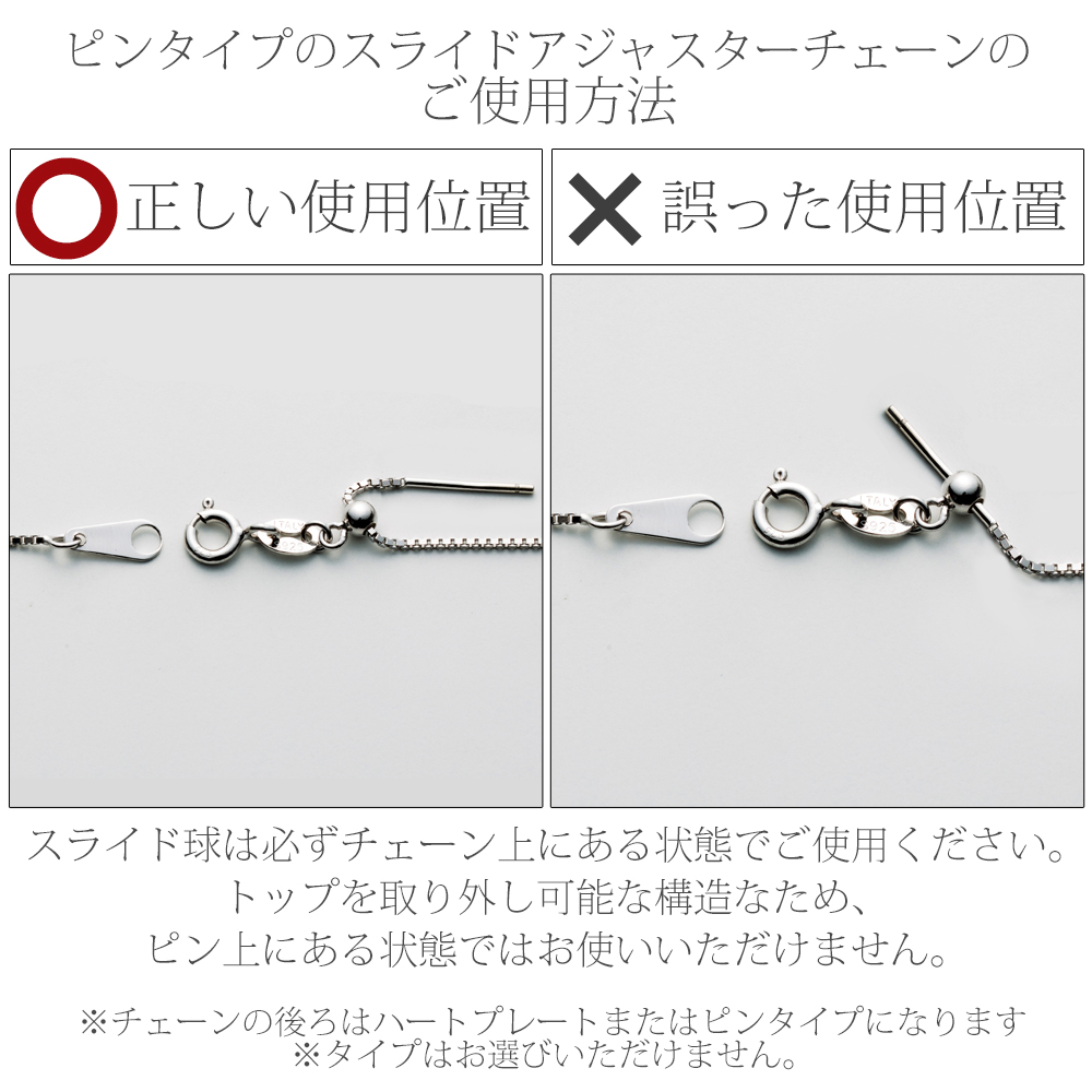 他店ではオプション料金のかかるスライドアジャスタチェーンを標準仕様としています。 長さ調節が自由自在で、ネックレスをつけたままでも調節可能です。
