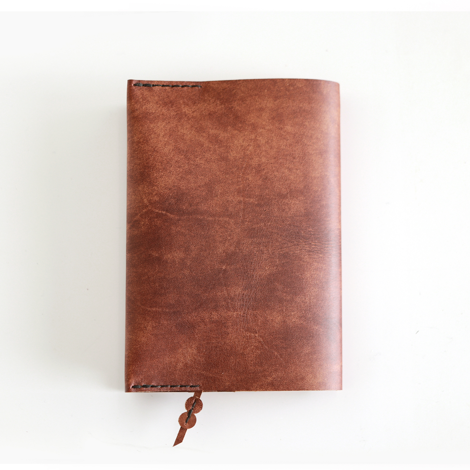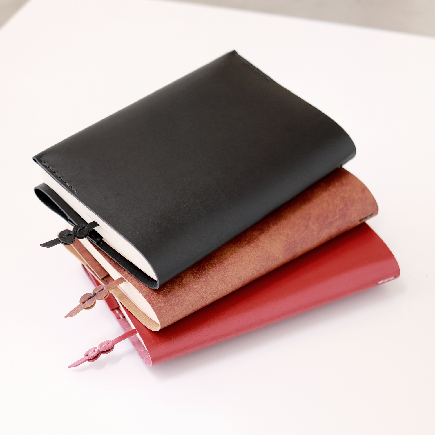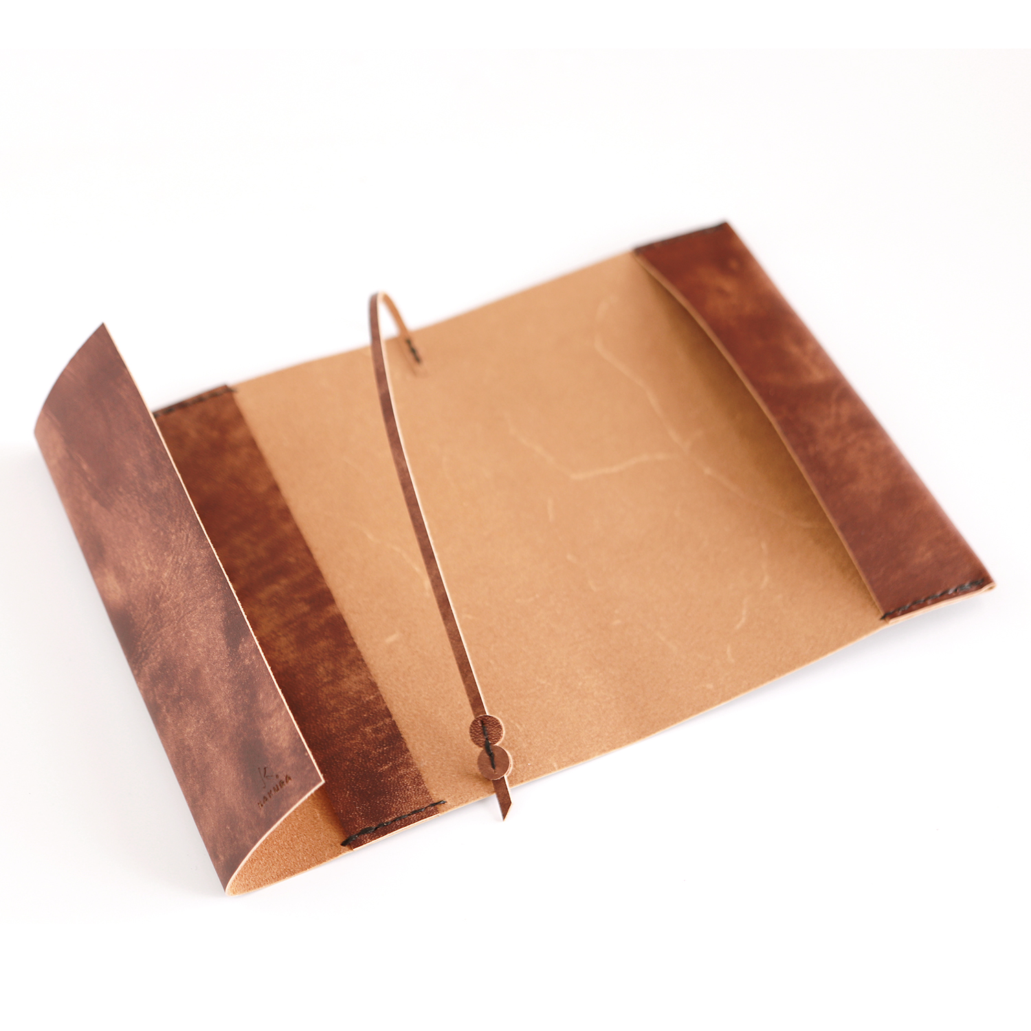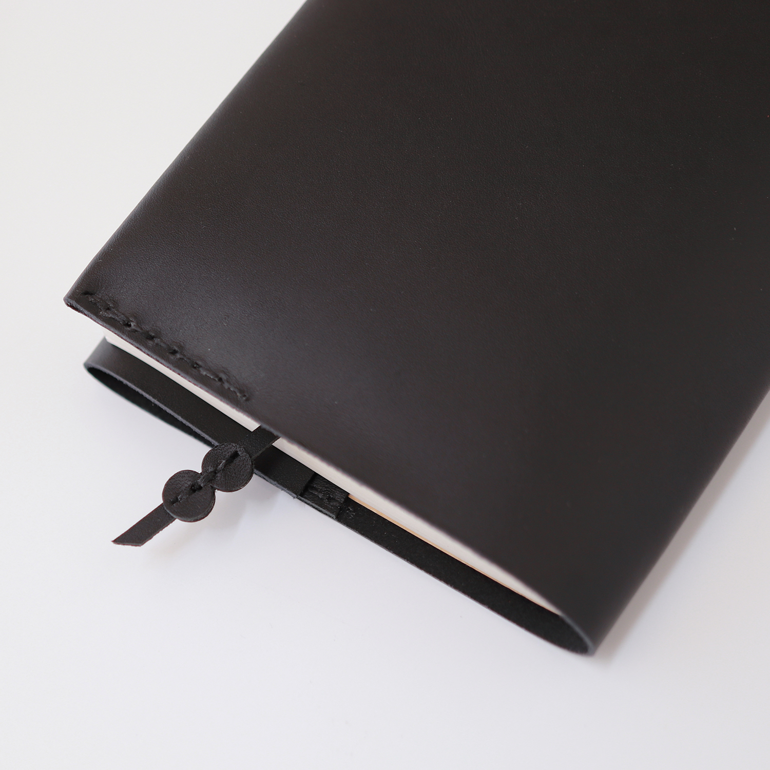 大口注文・法人のお問い合わせはこちら大切な本を一枚革で包み込みます。 共革のしおり紐の先には、ころんとした飾りボタン。見開き左側は、厚みに応じて折り返す仕様となっており、厚い本にもお使いいただけます。 使い始めは革の張りがあり、ふわりとしたつけ心地ですが、使い込むことでぴたりと本に馴染みます。 ※見開き左側の革は折り返すだけの仕様で、帯に差し込む仕様ではありません。