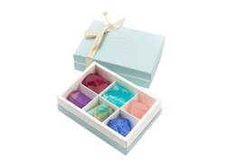 1箱で6種類のフレグランスソープをお楽しみいただけます。(ガーネット、ブルーアゲート、ローズクォーツ、アメジスト、ジェイド、ラピスラズリィ)自然の恵みを表現するかのように宝石の原石を精巧に再現した、植物性グリセリンを主成分・天然成分につくられた肌に優しい石けんです。