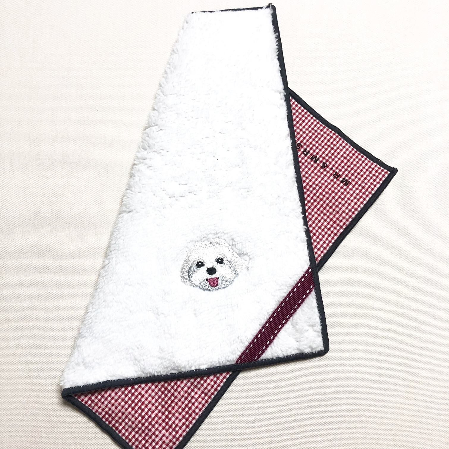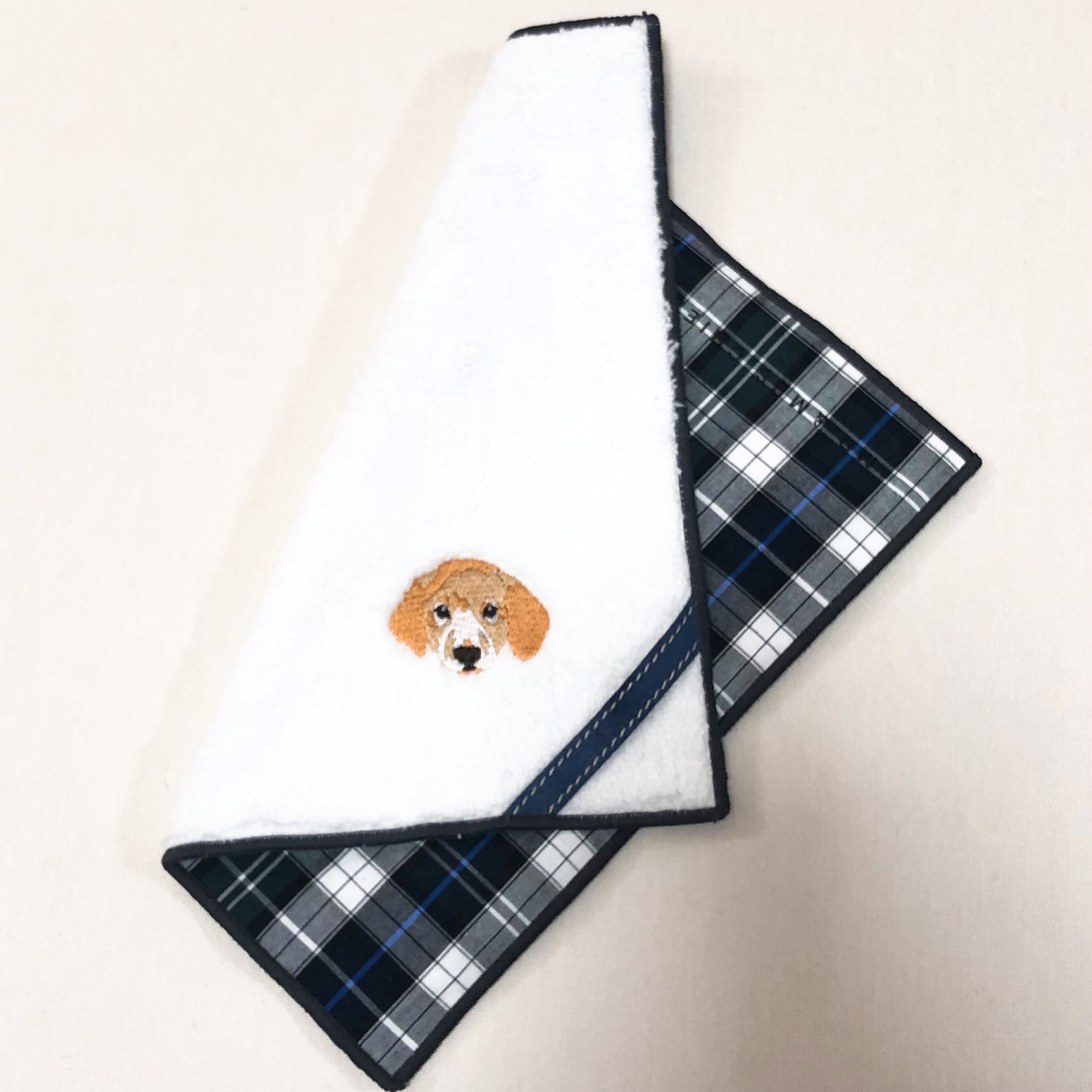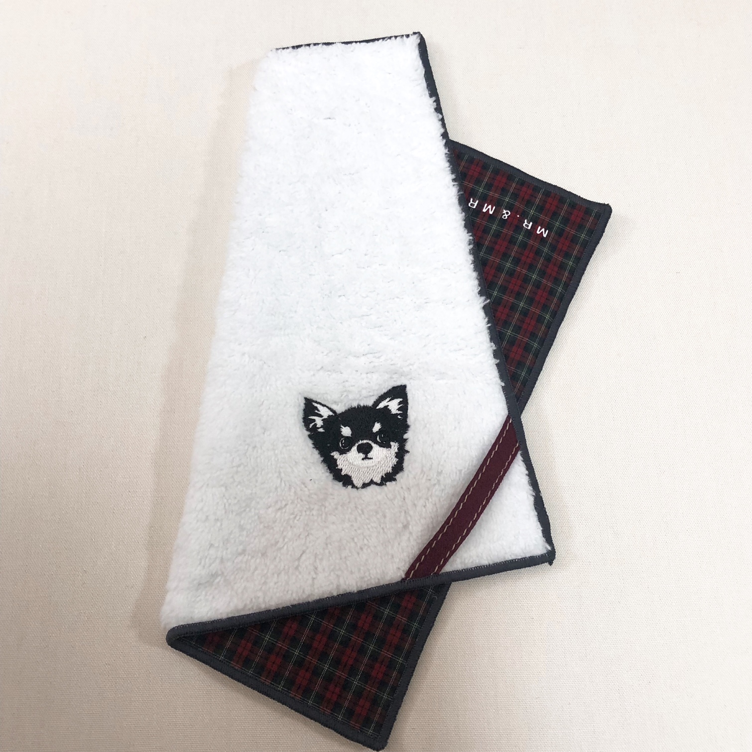 表はオリジナルのマイクロファイバーボアにワンちゃんの刺繍が映えます。 裏は浜松や播州の先染めの生地になっています。 タータンチェックやストライプなど、ボアと柄のありそうでなかった組み合わせです。