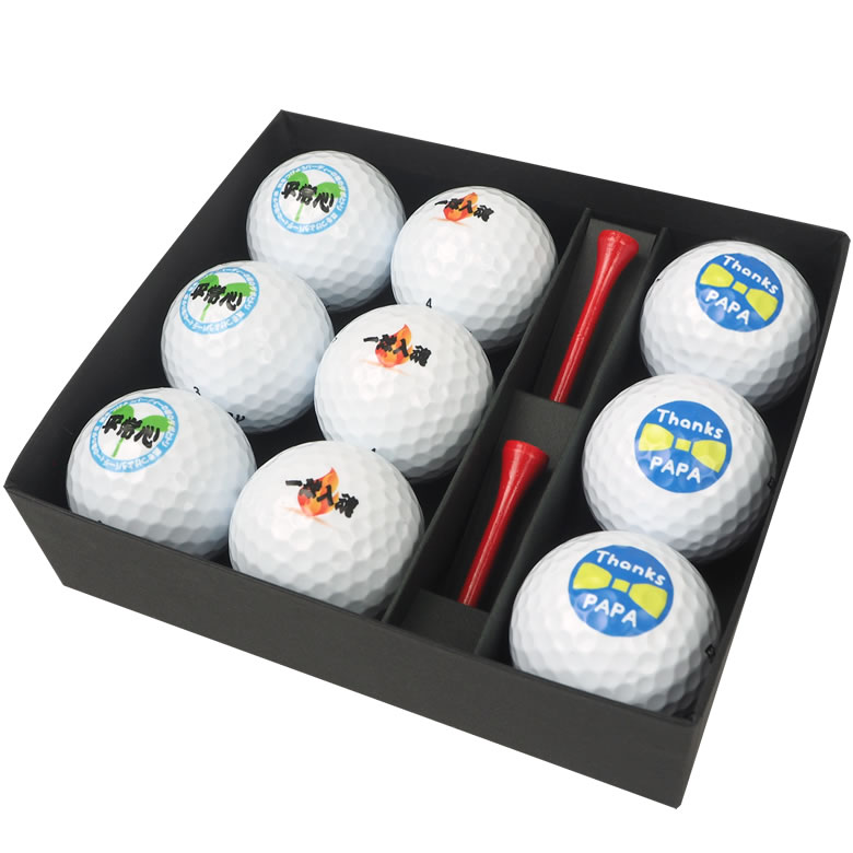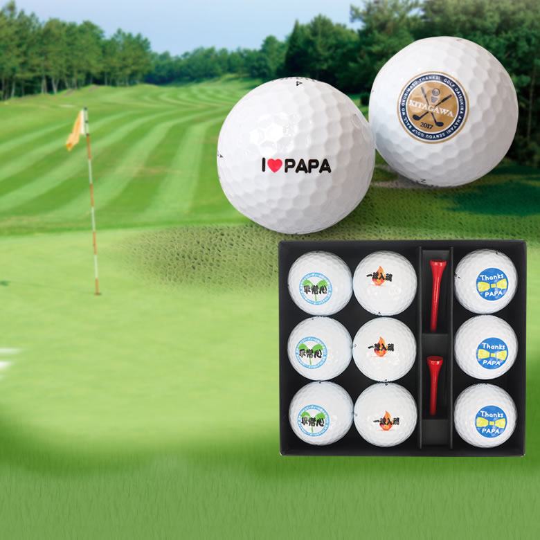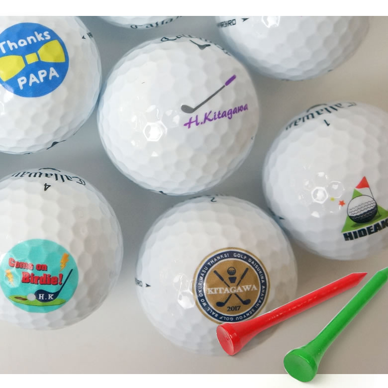 大口注文・法人のお問い合わせはこちらゴルフ好きの方にとって、何個あっても困らないゴルフボール。 そんなゴルフボールに、日頃の「ありがとう」を込めませんか。 名前やメッセージをいれてオリジナルなデザインにすれば、 思わず自慢したくなること間違いなし。 Teeを2本付けてお贈りします。
