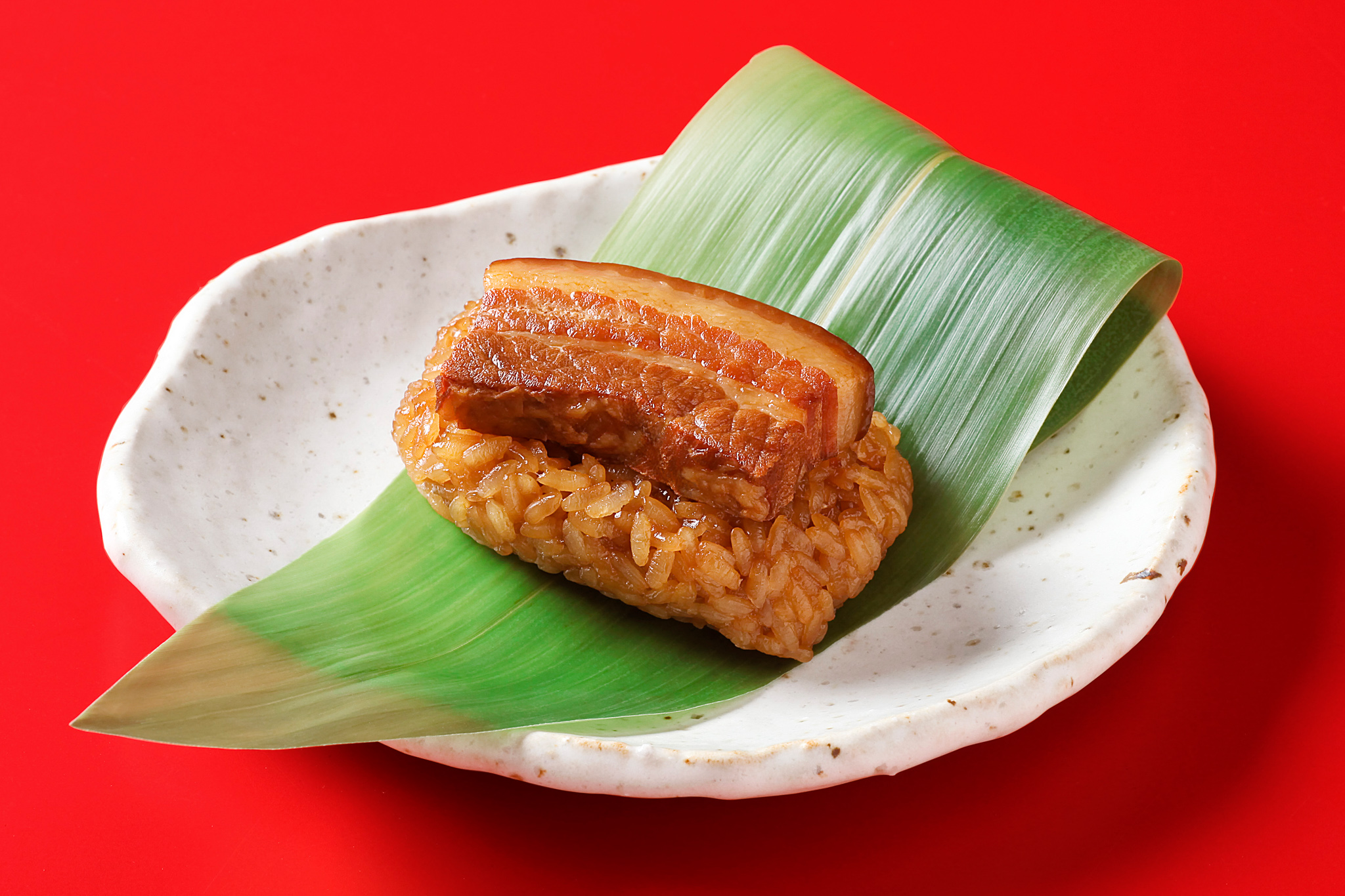 タレをしっかり吸わせたもち米の上に肉厚な豚角煮を乗せた笹ちまき。濃くなりすぎぬよう、かつおだしで整えております。