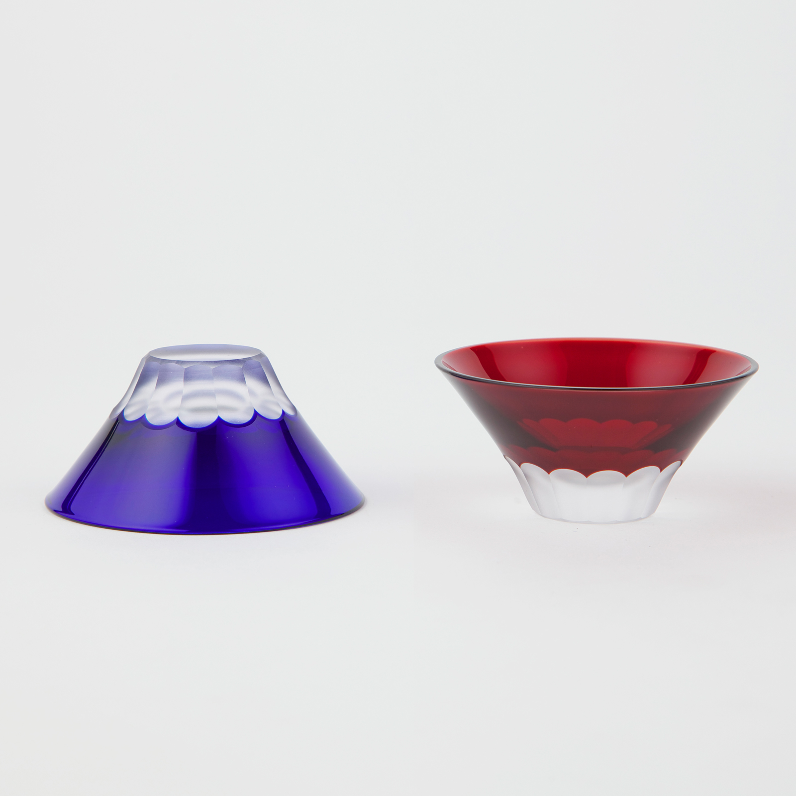 富士山に見立てた、江戸切子のお猪口2点のギフトセットです。江戸伝来の技術を継承し、熟達した切子工芸士がひとつ一つ手作りで作り出しています。 瑠璃(青富士)と紅(赤富士)に、精巧なカットを施し富士の雪を表現。 お猪口や前菜などの小鉢としてもお使いいただけます。