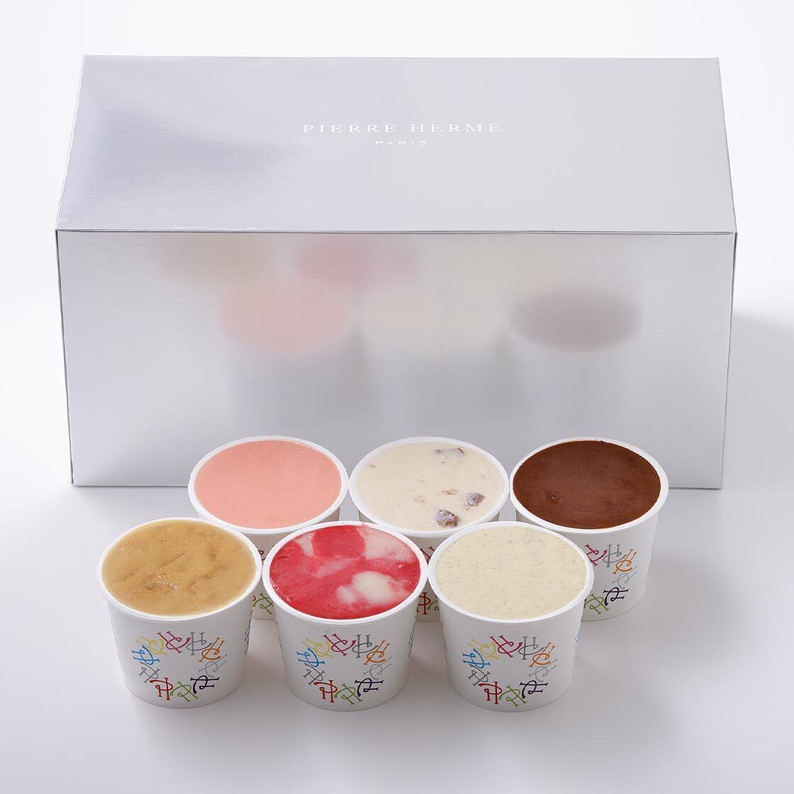 大口注文・法人のお問い合わせはこちらグラス・コレクションでピエール・エルメが最もこだわったのは、その口当たりとフレーバーです。 口にした瞬間、それらの織りなす優美な調和がもたらす快感は、つかの間日常を忘れさせてくれるかのようです。 瑞々しさを際立たせたアイスクリームをお楽しみください。 <内容> ・ソルベ ショコラ ・グラス ヴァニーユ ・グラス カラメル ・グラス ラムレザン ・グラス アンフィニマン ローズ ・ソルベ イスパハン 各1