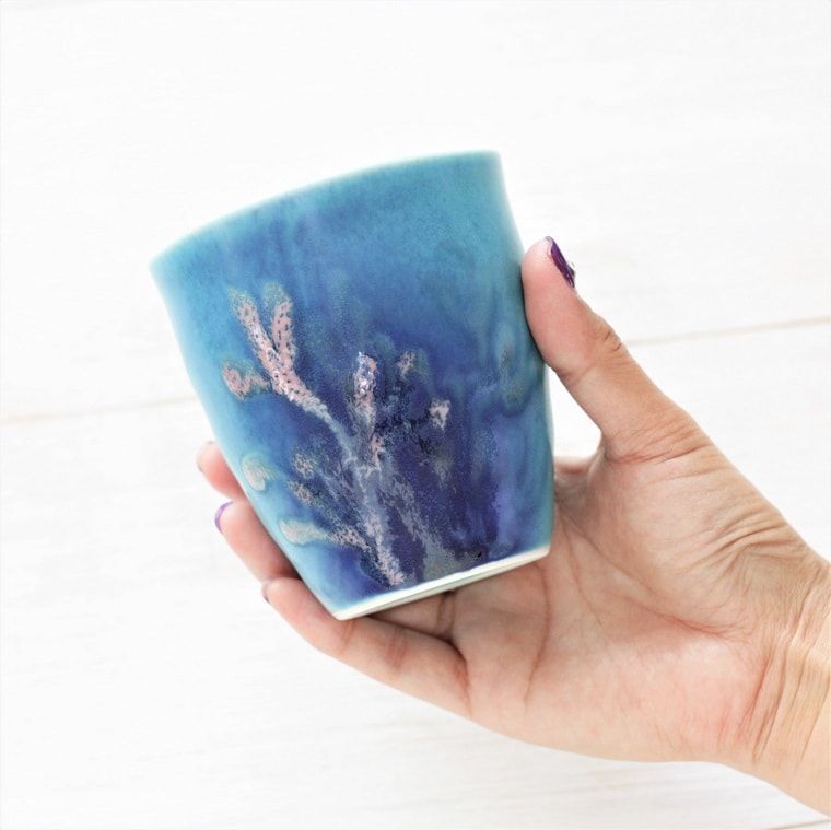 珊瑚のお花は、元気でいてほしいというお守りとして昔から用いられてきました。 そんな珊瑚のお花をあしらった器は、 コーヒーに紅茶、晩酌の器としても重宝します。 丸みを帯びたフォルムは手元にも良くなじみ温かみがあると好評です。