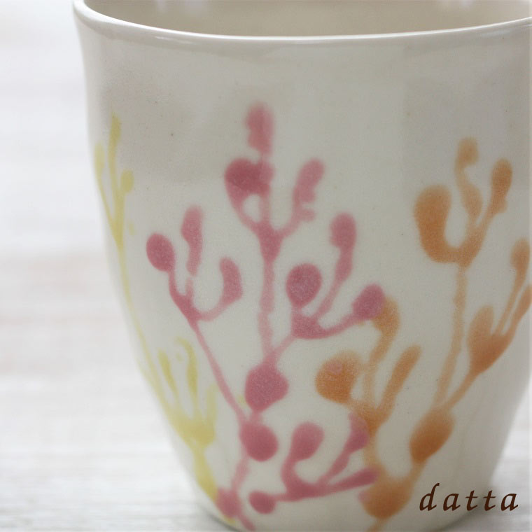 珊瑚のお花は、元気でいてほしいというお守りとして昔から用いられてきました。 そんな珊瑚のお花をあしらった器は、 コーヒーに紅茶、晩酌の器としても重宝します。 丸みを帯びたフォルムは手元にも良くなじみ温かみがあると好評です。
