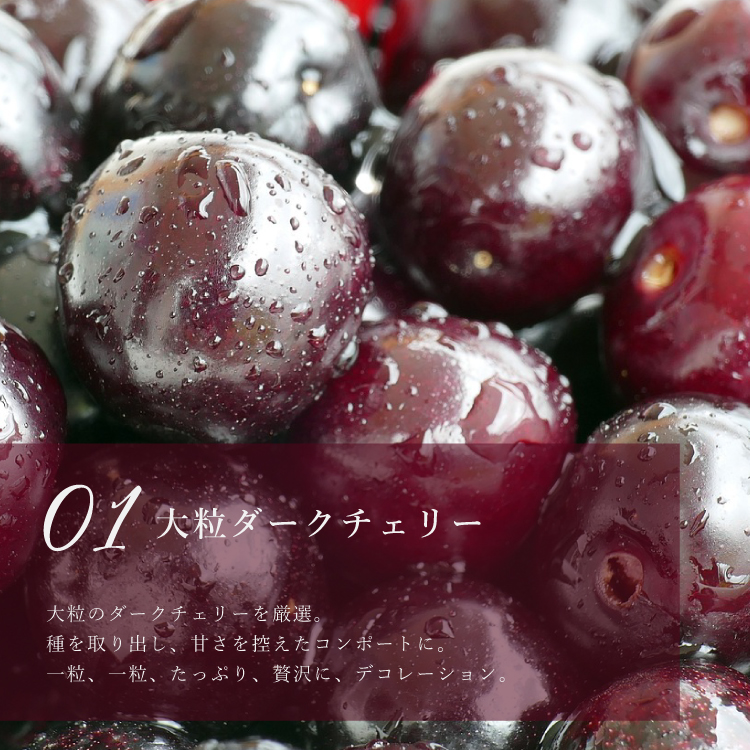 | 原材料 | ダークチェリー(チリ共和国産)、生クリーム、クリームチーズ、粗糖、小麦粉、バター、卵、アーモンドプードル、全粒粉小麦粉、ナパージュ(水飴、砂糖)、粉糖、添加物、安定剤(ペクチン)、ゼラチン、酸味料、香料 (一部に乳成分、卵、小麦を含む) |