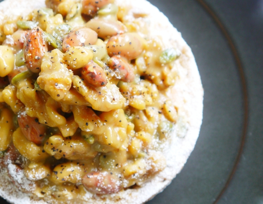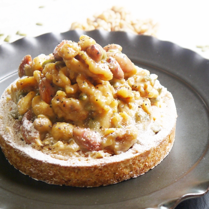 ザクザクタルトに4種のナッツをたっぷり。 黒胡椒とお塩がアクセント。 長崎県平戸産の粗挽き全粒粉小麦をタルト生地に配合し、 小麦の旨みと香ばしさを引き出して、ザクッと焼き上げました。 しっとりアーモンド生地に、自家製キャラメルクリームと、 アーモンド、くるみ、カシューナッツ、パンプキンシードの4種のナッツを贅沢に加え、アクセントに平戸の塩と、ブラックペッパーで大人味に引き締めました。