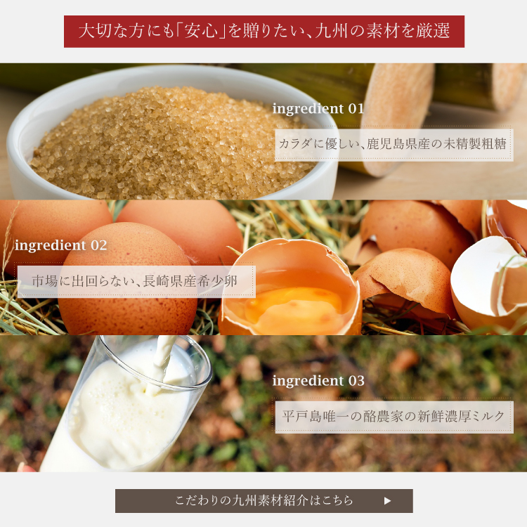 大口注文・法人のお問い合わせはこちら生産数が少なく市場出回ることのない長崎県産希少卵を使用した ふるふるなくちどけのプリン。 平戸島唯一守り継がれる酪農家育ちの絞りたて生乳を、 カラダに優しい未精製の九州産粗糖でことこと炊き上げた、 ミルキーな生キャラメルソースをトッピング。 さらに表面にまぶした鹿児島産粗糖をバナーで焦がしブリュレ仕立てに。 『パリッ、トロ~リ、ふるふる』な食感と、 卵とミルクの味わいが幾重にも広がる贅沢な逸品。 老若男女、性別問わず愛されるスイーツに仕上げました。